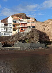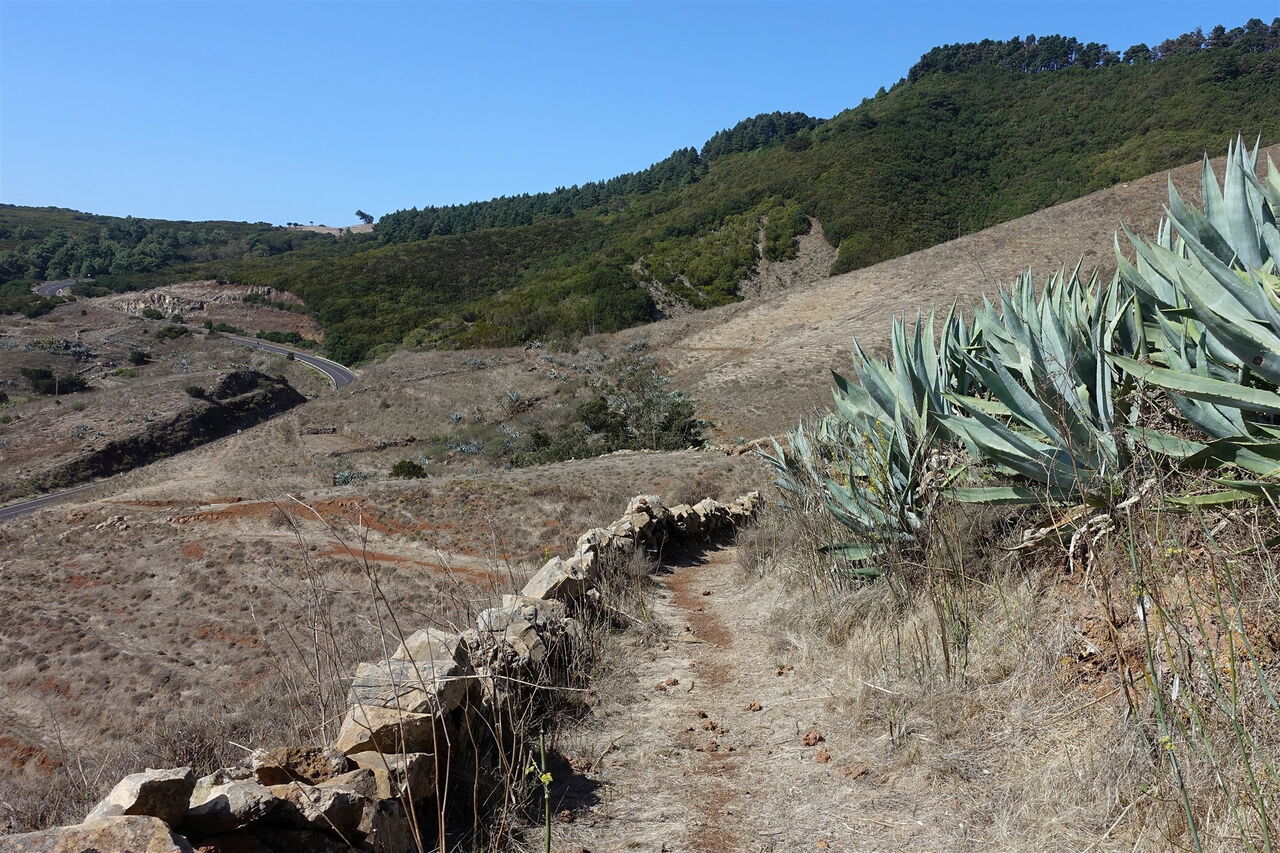 Nach einem kurzen Anstieg wandern wir durch eine kleine Schlucht und erreichen die Unterführung der Verbindungsstraße von Valverde nach San Andres. Direkt hinter der (05) Unterführung (916 m) steigen wir nach rechts aus dem Bachbett, kommen vorbei an einem Haus und gelangen so auf die geteerte Straße. Wir gehen das restliche Stück des Rückwegs auf dem bekannten Hinweg.