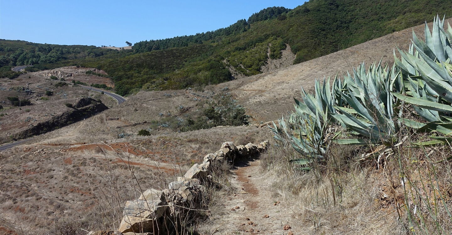 Bei Agaven, die längs am Berg herunterlaufen, ist kaum noch ein Pfad zu erkennen. Wir gehen aber auf dem weiterführenden Bergrücken durch die Agaven hindurch, über einen kleinen Zaun und in einer Erosionsrinne weiter in Richtung einer Baumreihe. An dieser (04) Schlüsselstelle (1009 m) gehen wir direkt vor dieser Baumreihe rechts und nach wenigen Metern ist wieder ein Pfad zu erkennen. Dieser ist aber von Erosionsrinnen stark beschädigt. Während wir den Hang queren, sieht man bereits in der Ferne den weitaus breiteren weiterführenden Camino.