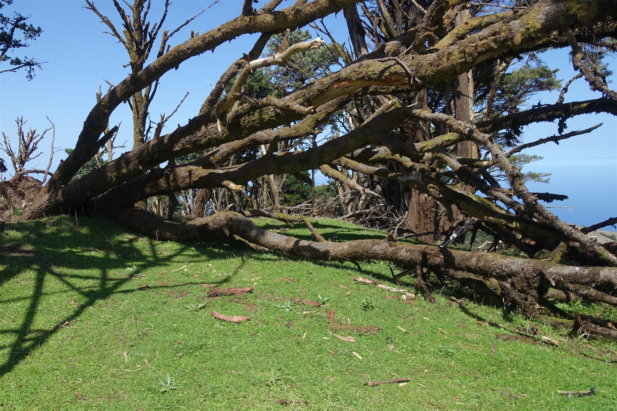 Es folgt ein landschaftlich sehr schönes Wegstück durch einen wohlriechenden Kiefernwald und vorbei an einem künstlich angelegten Wasserreservoir. Der Pfad endet an einer (02) Kreuzung (1047 m), wir gehen geradeaus weiter, auf einem Pfad links entlang einer Mulde. Am Ende der Mulde gehen wir bei der Weggabelung halb rechts, vorbei an Zedernwacholderbäumen. Die Piste wird zu einem mit großen Felsen gesäumten Pfad. Vorbei geht es an einer kleinen Staustufe und durch ein Waldstück, bis wir die Piste erreichen. Nachdem wir 215 m auf dieser bergauf gegangen sind, halten wir uns bei der darauffolgenden Weggabelung halb rechts und ignorieren den linken Abzweiger zum Heiligen Baum Arbol Garoe.