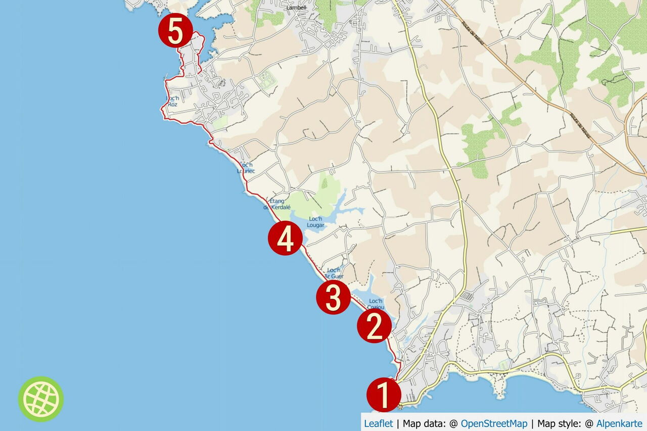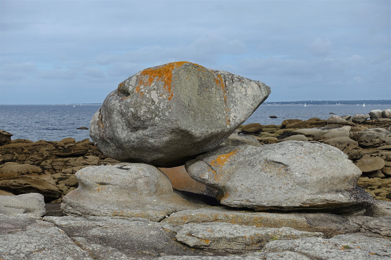 Es geht vorbei an zwei Parkplätzen, bei Porzh Ginan gehen wir parallel zur Straße und erreichen die Landspitze 05 Pointe Pouldohan (7 m). Auch hier zieren mächtige Felsen das Landschaftsbild. Auf Höhe des Strandes gehen wir über eine kleine Holzbrücke, der Pfad führt an einem kleinen Waldstück vorbei. Wir erreichen einen weiteren Strandabschnitt und eine Bucht mit Ankerplätzen. Der Weg führt landeinwärts, kurz vor einem Parkplatz gehen wir links, um dann bei der darauffolgenden Weggabelung links Richtung Meer zu gehen. Wir wandern nun kontinuierlich auf dem Küstenpfad entlang eines Meeresarms, der weit ins Land hereinreicht, bis zu seinem südlichen Ende. Hinter einer Holzabsperrung – parallel zu einem Bachlauf – gehen wir bis zur Straße hoch, um dort rechts nach 75 m auf der gegenüberliegenden Straßenseite die Bushaltestelle zu finden.