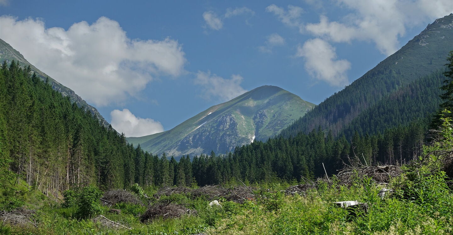 Inzwischen sind wir so weit durch die 04 Račkova Dolina (1218 m) aufgestiegen, dass der Wald den Blick freigibt und wir direkt auf den 2176 m hohen Berg Klin blicken können. Ab dort, wo die Piste in einen Pfad übergeht – hier befindet sich auch eine kleine Parkbucht – ist der Wanderweg in der Zeit vom 1. November bis zum 14. Juni eines jeden Jahres gesperrt. Wir kommen schließlich an einem weiteren überdachten Picknickplatz vorbei.