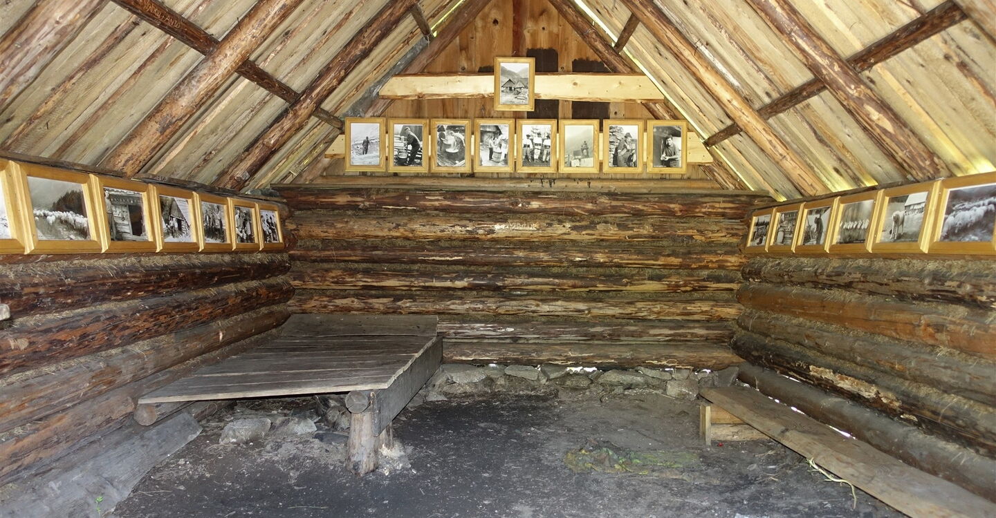 Wir queren erneut einen Bachlauf, bevor wir das Etappenziel erreichen, den 05 Koliba pod Klinom (1376 m). Es erwartet uns ein ursprüngliches Hochtal, eingebettet zwischen sechs mächtigen Zweitausendern. Besonders beeindruckend ist die felsige Spitze des 2163 m hohen Nižná Bystrá, der östlich der Hütte liegt. Bei der Recherchereise besuchte auch ein Förster die Hütte. Meine brennende Frage war: Gibt es hier Bären? Er antwortete, er hätte hier noch nie einen gesehen. Vielleicht schläft man mit diesem Wissen etwas beruhigter in der Hütte. Gute Nacht!