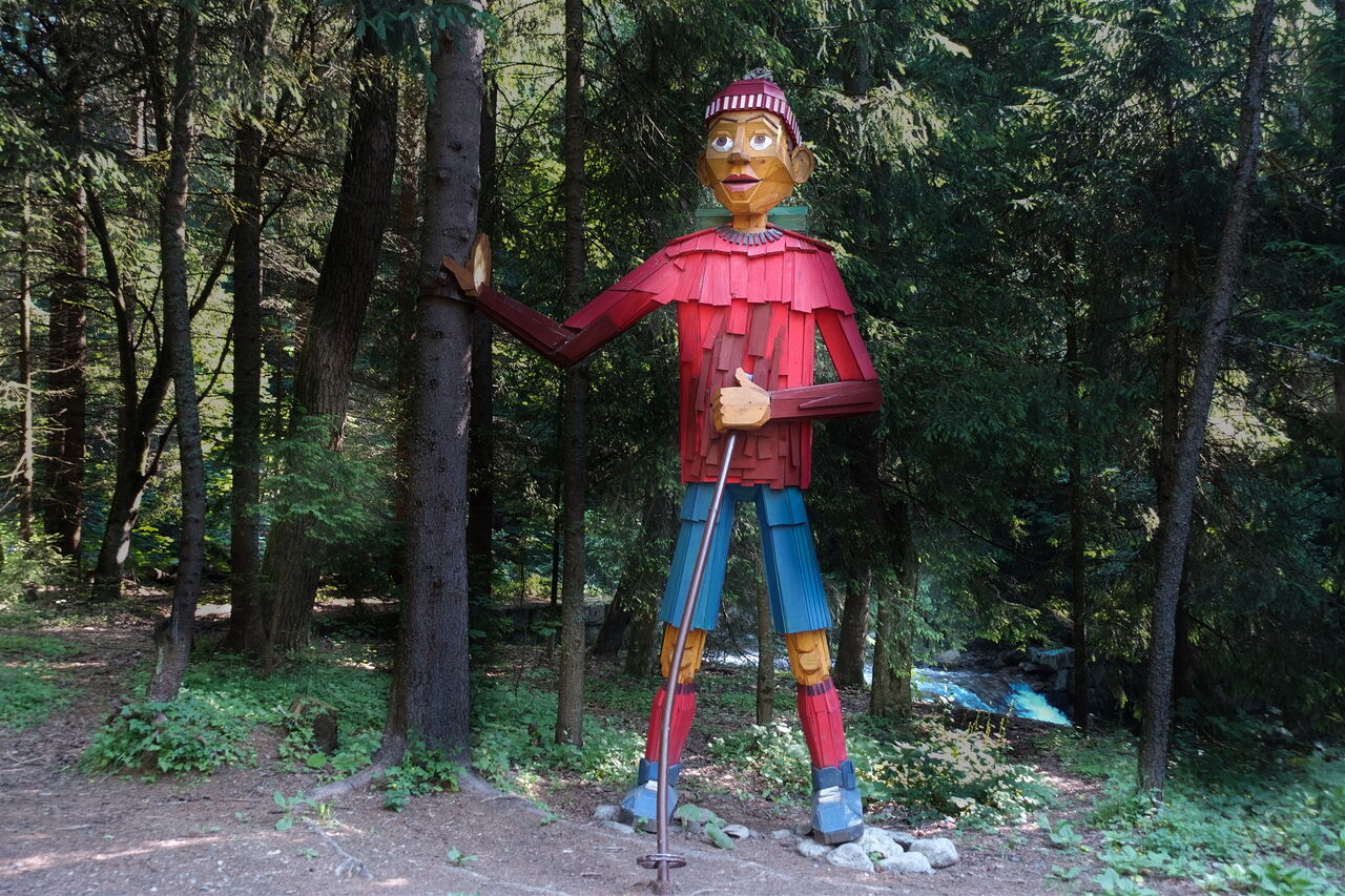 Vom großen Parkplatz am Hotel 01 Horská Chata Orešnica (875 m) gehen wir auf der Anfahrtsstraße bergab, bis wir die große Holzfigur erreichen. Vor der Brücke und den Wegweisern gehen wir halb links in die Úzka Dolina.