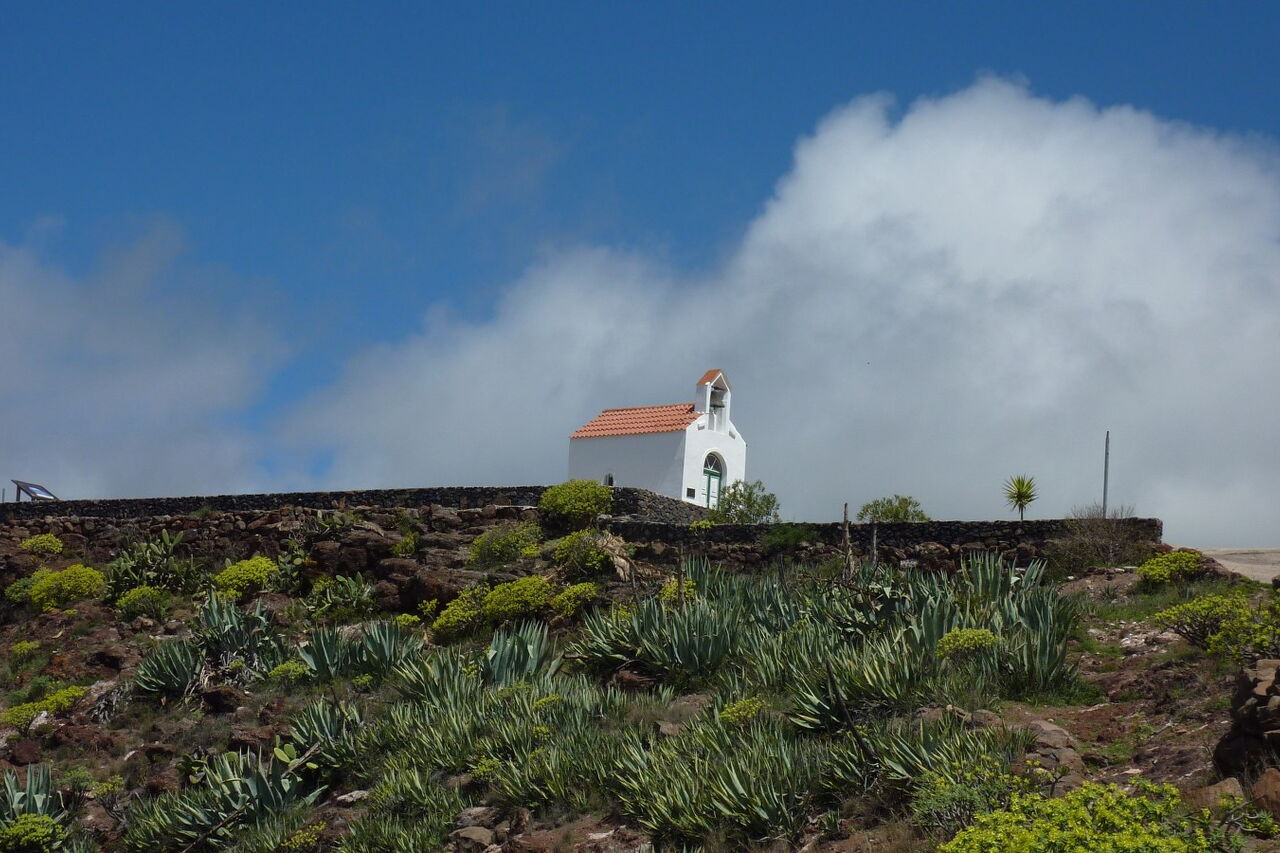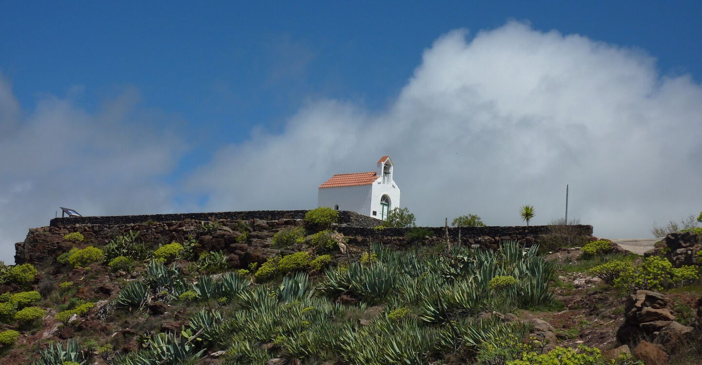 Nach 100 m auf der Asphaltstraße gehen wir scharf links. Wir befinden uns nun auf der GR 132 Richtung Valle Gran Ray und erreichen über einen Höhenzug die sehr schön gelegene (03) Ermita de Nuestra Señora de Guadalupe (756 m). In den sechziger Jahren zu Ehren der Jungfrau von Guadalup gebaut, liegt sie sehr schön auf einem Felsvorsprung oberhalb des Dorfes Gerián. Es ergeben sich atemberaubende Fernblicke in das tief unter uns liegende Barranco und die lang gezogenen Bergrücken, die das Valle Gran Rey flankieren. Auch den weiterführenden Weg können wir von hier aus sehr schön ausmachen. Dieser führt hinter der Kirche in nordöstliche Richtung taleinwärts. Wir folgen diesem Weg, bis wir den nächsten linken Abzweiger bergab Richtung Valle Gran Ray nehmen.