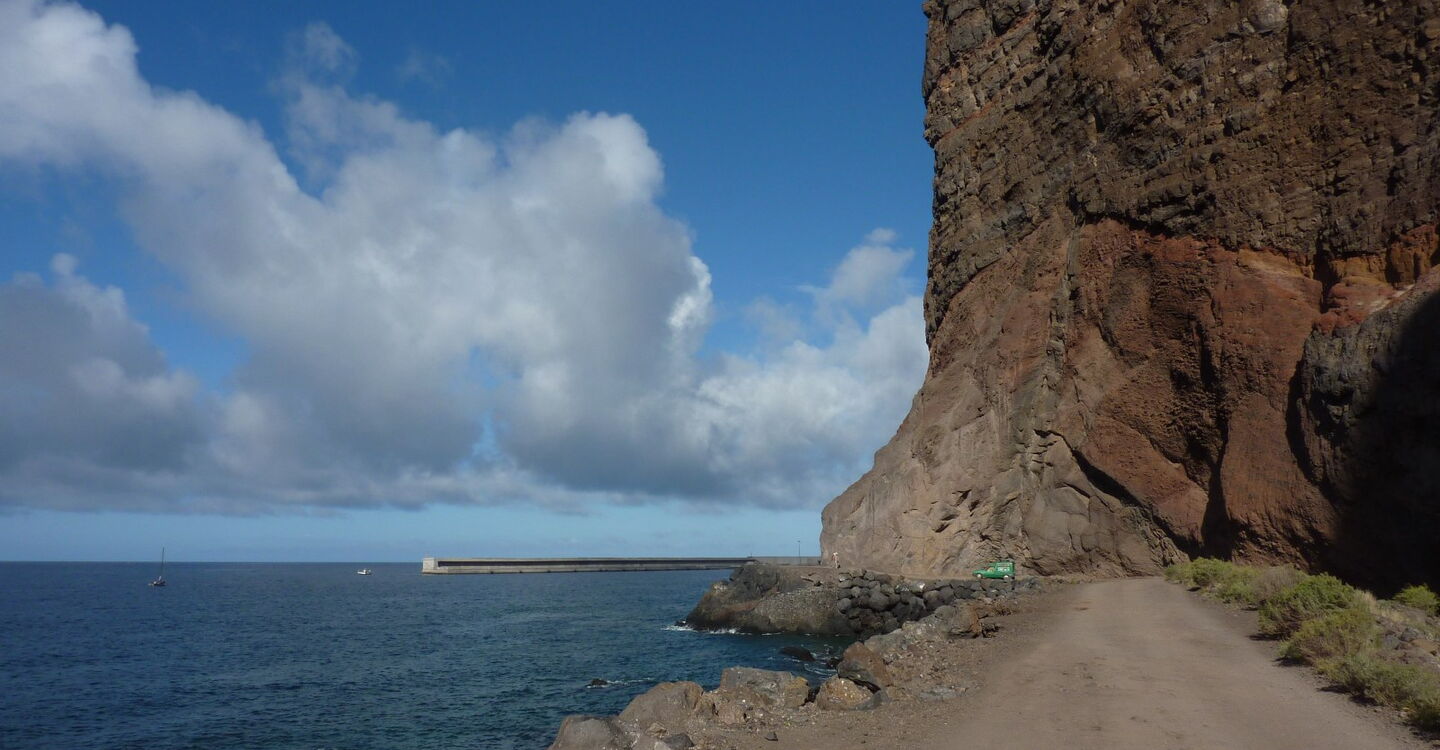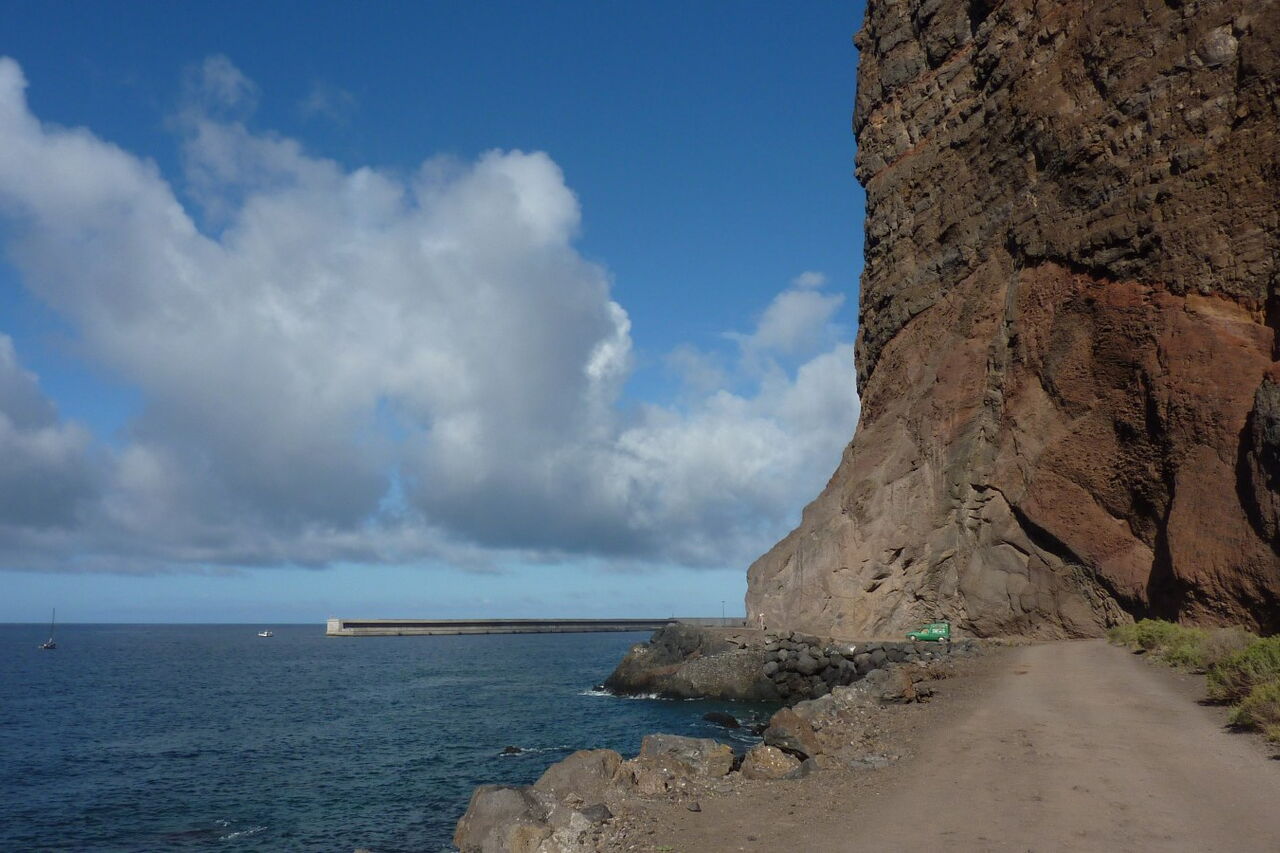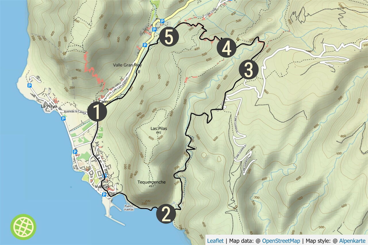 Vom (01) Start und Ziel (46 m), dem ersten Kreisverkehr bei der Tankstelle im unteren Valle Gran Rey, laufen wir auf der Hauptstraße zunächst am Busbahnhof vorbei und dann weiter Richtung Vueltas, dem Hafen in Valle Gran Rey. Nach 1,1 km gehen wir links in die Einbahnstraße Calle Las Vueltas, passieren Geschäfte und Restaurants und erreichen den durch die Hafenmole geschützten schwarzen Sandstrand, den Playa de Vueltas.