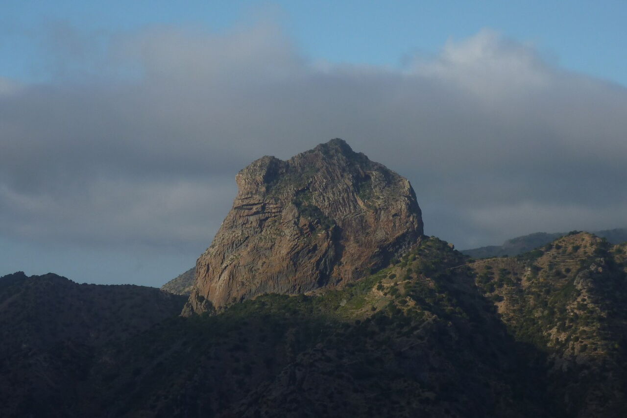 In einer 180-Grad-Linkskehre der Schotterpiste verlassen wir diese nach rechts Richtung Hermigua. Kurz hinter den ersten Häusern von Tamagarda endet der Weg und wir gehen rechts Richtung Vallehermoso. Sobald wir eine Wegverzweigung mit drei Wahlmöglichkeiten erreichen, nehmen wir den Pfad mit der Wegbeleuchtung. Nach einem kurzen Stück auf einer Asphaltstraße verlassen wir diese in der folgenden Linkskehre bereits wieder, um nach rechts auf einen wunderschön angelegten Wanderweg einzuschwenken. Nach der Überschreitung eines Bergrückens steht imposant direkt vor uns der 220 m höhere Felskoloss (05) Roque Cano (439 m). Nach einem steilen Abstieg gehen wir rechts talauswärts und erreichen bald einen Abzweiger nach links Richtung Vallehermoso. Diesen ignorieren wir aber und gehen rechts über die Terrassenfelder, bis wir die Asphaltstraße erreichen, die uns zum Parkplatz führt.