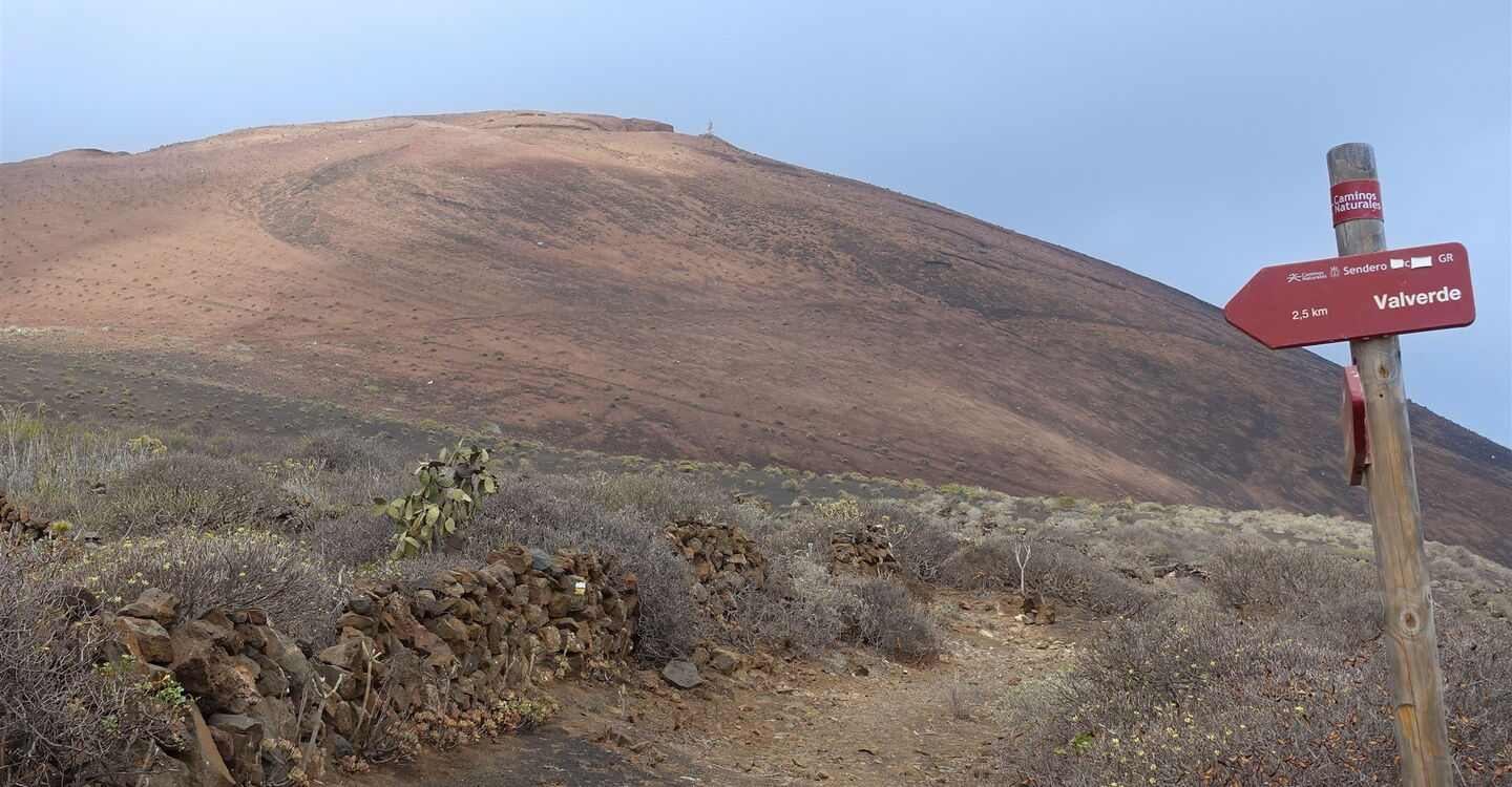 Bei einem Lavasteinhaus befinden sich viele Wegweiser. Wir ignorieren den Abzweiger Richtung (05) Echedo (223 m) und gehen links Richtung Valverde. Der Pfad auf schwarzen Lapilli mündet in eine geteerte Straße, der wir weiter bergauf folgen, bis sich nach 360 m ein großer Felsen am Wegesrand befindet. Hier gehen wir nur einige Meter rechts in die Hauszufahrt und dann links auf dem sehr steil ansteigenden Pfad. Auf der nachfolgenden Straße erreichen wir hinter einer Anhöhe ein großes Gebäude, überqueren die Straße nach halb rechts und gehen links in die gepflasterte Straße. Nach 75 m überqueren wir den Zebrastreifen und gehen in die Einbahnstraße, bis wir bei einem Stoppschild auf den Hinweg gelangen. Wir gehen das restliche Stück des Rückwegs auf dem bekannten Hinweg.