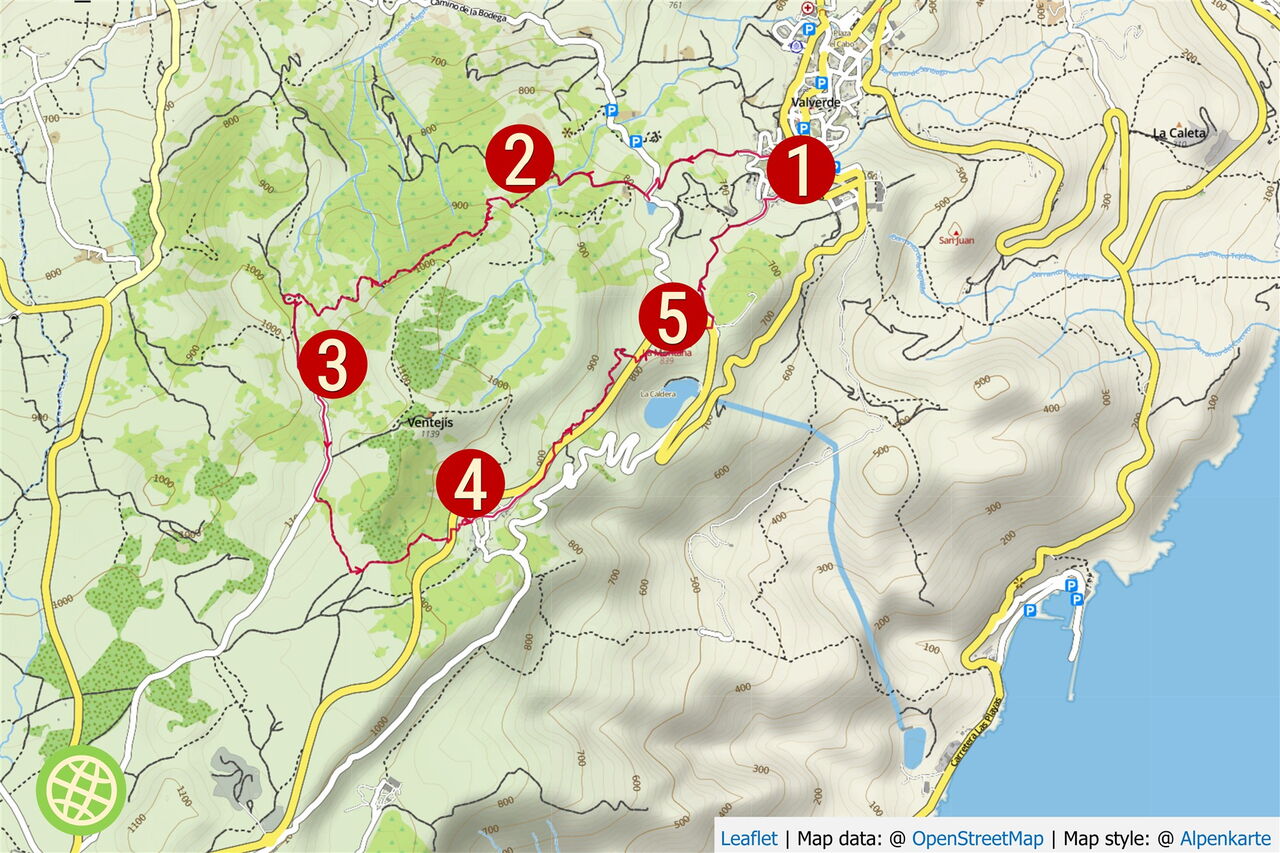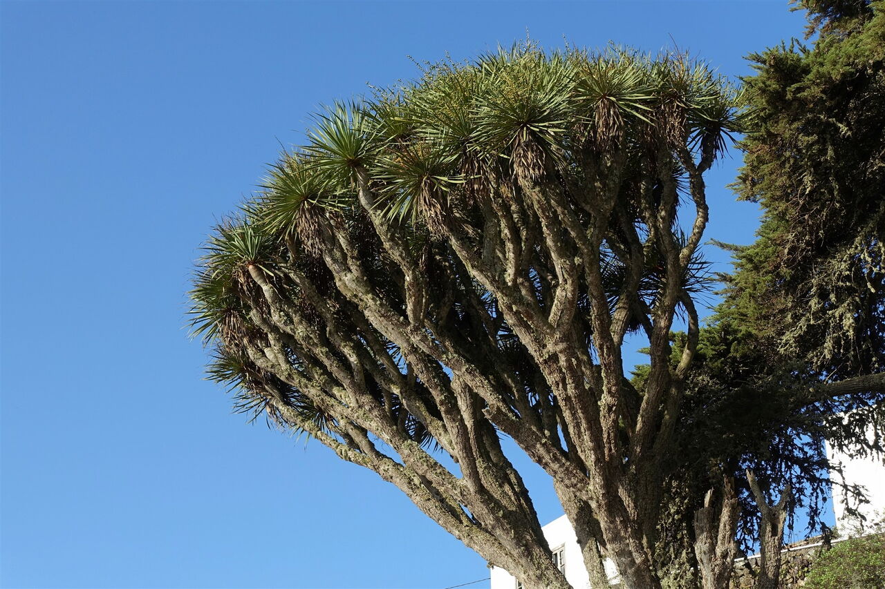 In (01) Valverde (619 m) gehen wir auf der weiterführenden Straße Richtung Frontera, vorbei an der wunderschönen Nordmanntanne und dem danebenstehenden ältesten Drachenbaum von Valverde. Bei dem Verkehrsspiegel und dem grünen Haus gehen wir auf der nach links abzweigenden Einbahnstraße bergauf. Das Bildnis der Madonnenfigur der Virgen de Los Reyes lassen wir links liegen, gehen geradeaus über die querende Straße und vorbei an der riesigen Norfolktanne. Nach einer scharfen Rechtskurve der Straße endet diese. Hier biegen wir scharf links ab und nach 110 m – bei den vier Pinien und noch vor dem Wasserreservoir – wandern wir rechts weiter.