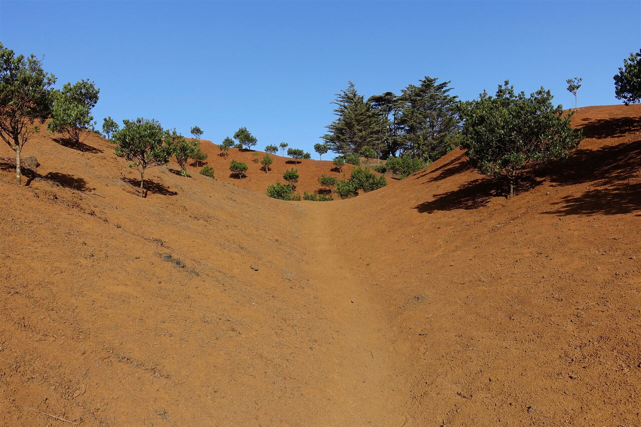 Hinter einer Senke mit Terrassenfeldern ist der Weg kurzfristig mit Steinen gesäumt. Aus dem Pfad wird eine Piste und auf einem halb rechts abzweigenden Pfad erreichen wir eine Wasserstelle mit drei angelegten Wasserreservoirs. An der nachfolgenden Piste gehen wir links bergauf, ignorieren die folgenden zwei rechten Abzweiger und erreichen den Heiligen Baum (03) Arbol Garoe (1032 m). Auf der Anfahrtsstraße zur Sehenswürdigkeit gehen wir bergauf und ignorieren den linken Abzweiger auf der Anhöhe, um dann nach 215 m – oder 50 m hinter einem Bachbett – die Piste nach links zu verlassen. Weiter geht es auf dem Pfad, der durch das kleine Waldgebiet führt.