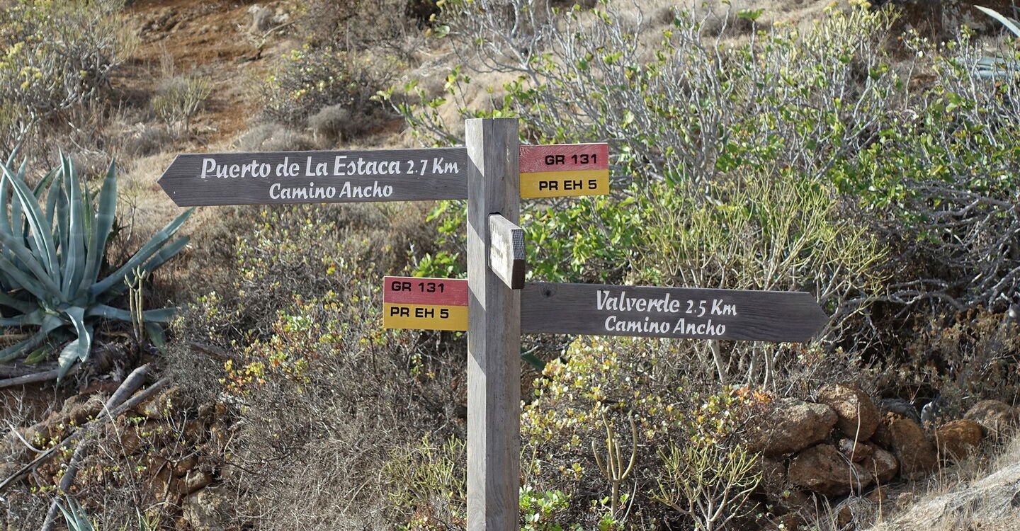 Vom (01) Busbahnhof (616 m) in Valverde gehen wir zur Hauptstraße zurück. Wir gehen weiter auf der ortsauswärts führenden Straße Richtung San Andres und verlassen diese auch gleich wieder nach links, ausgeschildert Richtung Parque Eolico und einige Meter weiter Richtung Puerto de La Estaca. Der Abstieg erfolgt auf dem sogenannten Camino Ancho.