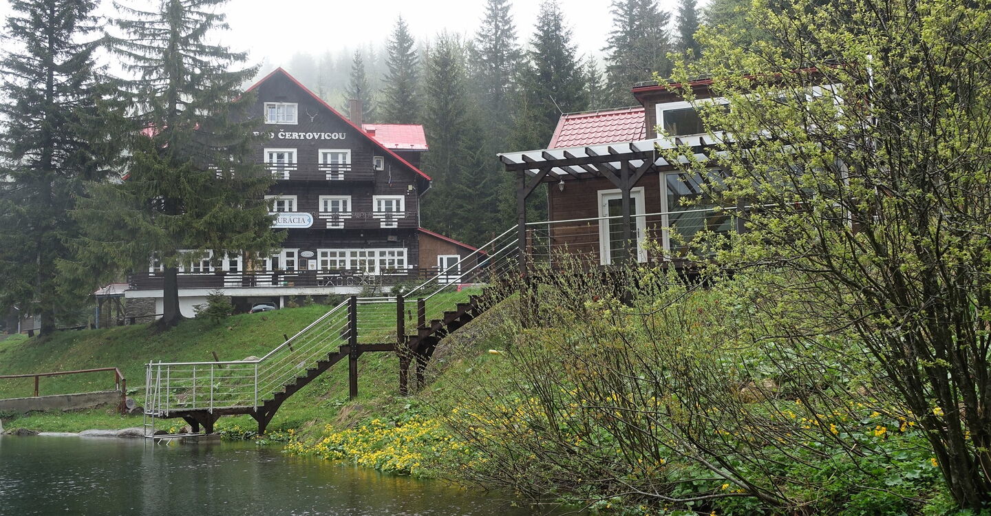 Gemächlich geht es auf der Forststraße bergab bis zum Pass 05 Čertovica (1232 m). Noch vor der Passstraße mit den Häusern führt rechts eine schmale asphaltierte Straße bergab. An dieser Stelle befindet sich auch ein Wegweiser Richtung Chata pod Čertovicou (100 m). Nach kurzem Abstieg erreichen wir eine Stichstraße, die zur Unterkunft und dem dazugehörigen Restaurant führt. Lässt man die Stichstraße aus, so kommt man auf dem Weg ins Tal an weiteren historischen Bauernhäusern vorbei. An der Ortsdurchgangsstraße von Vyšná Boca gelangt man rechts bis zum Ausgangspunkt.