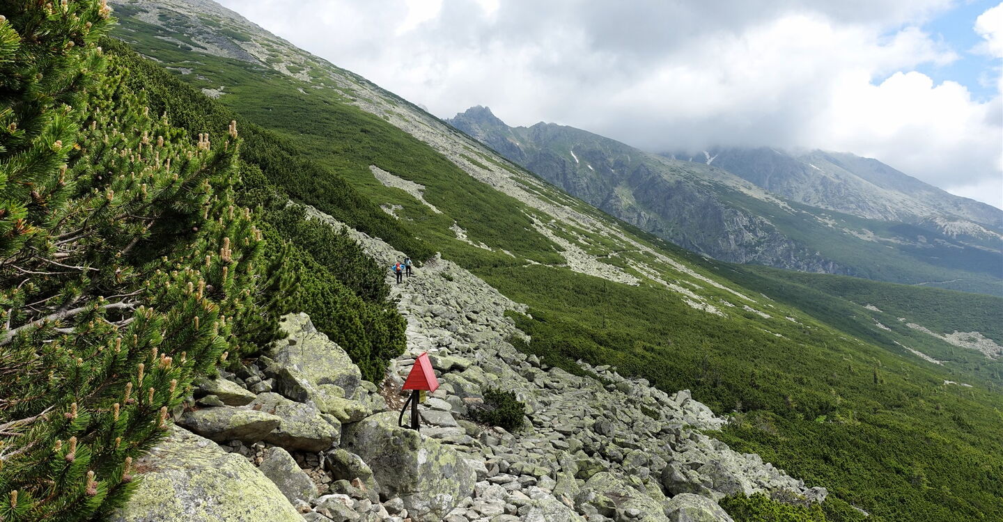 Wir queren den natürlichen Abfluss des Sees und folgen der Ausschilderung Richtung Sliezsky dom. Auf dem folgenden Teilstück schaut man über das Zipser Becken bis in die Hohe Tatra. Bei der Weggabelung 03 Rázcestie pod Suchým vrchom (1743 m) gehen wir halb rechts und leicht bergab auf dem gelb markierten Wanderweg.