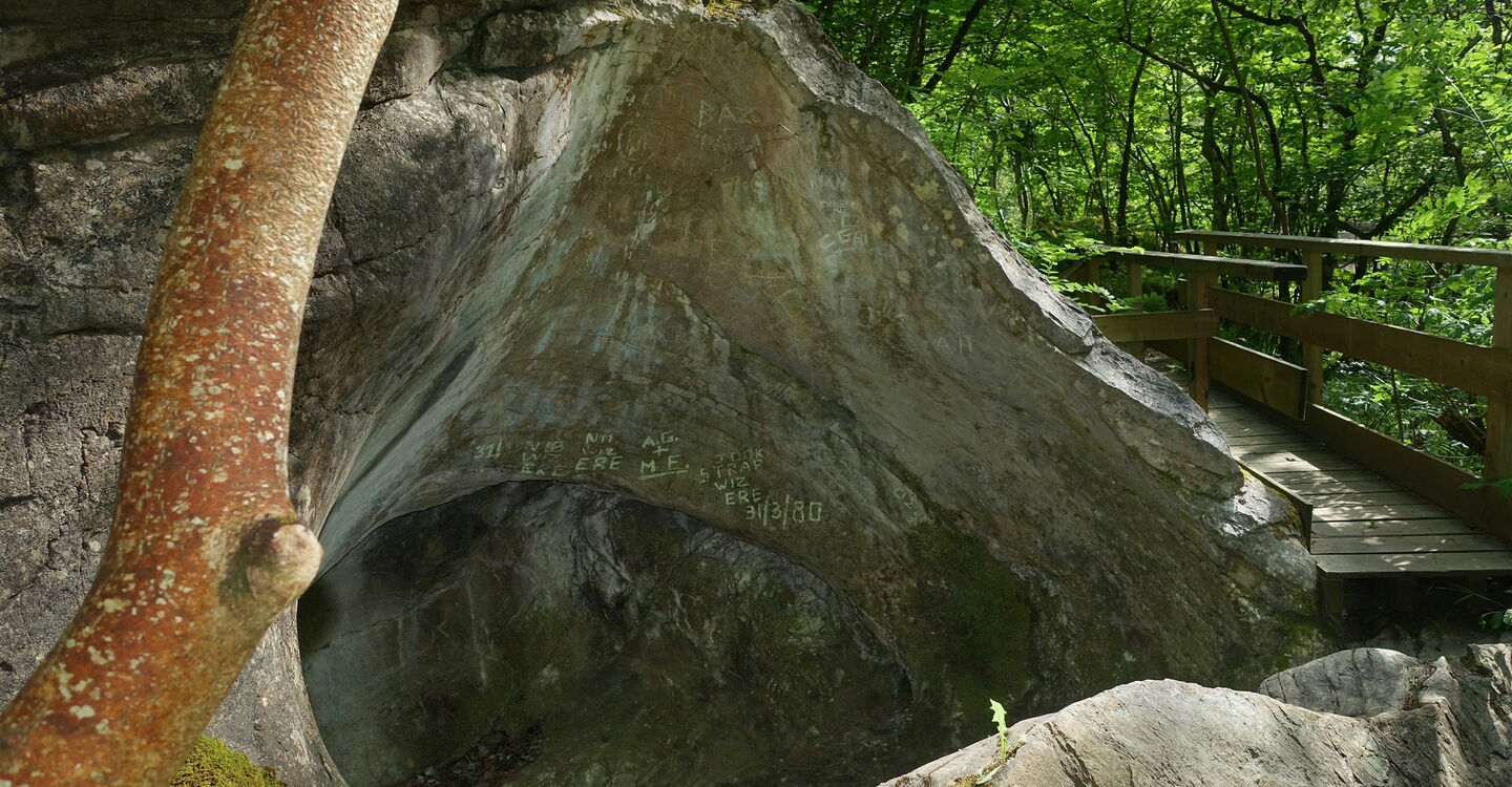 Im weiteren Verlauf führt uns der Pfad in eine kleine Schlucht. Wir kommen an einer kleinen Staustufe, einem Picknickplatz und dem wirklich sehr kleinen Wasserfall Linen Apron vorbei. Kurz vor einer Fußgängerbrücke biegt nach rechts ein Pfad zum imposanten 03 Giants Chair (178 m) ab. Hinter der Fußgängerbrücke, bei einem riesigen vertrockneten Baum, gelangen wir auf die Fahrstraße.