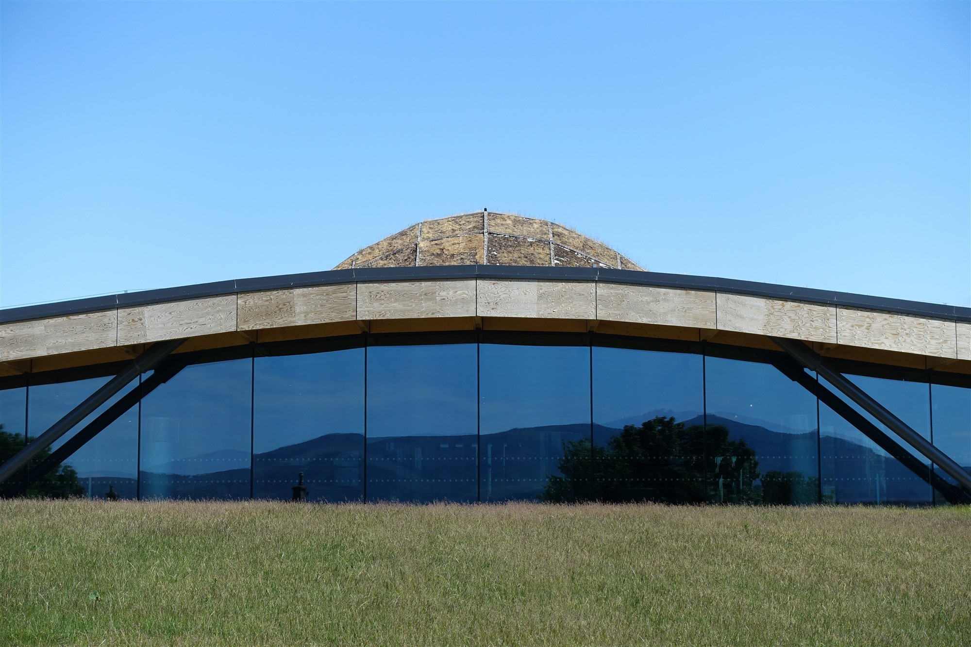 An der Hauptstraße gehen wir zurück über die Brücke, queren die Straße nach links, gehen hinter dem Friedhof rechts, an der darauffolgenden Holzbrücke rechts und am Parkplatz links über die 1900 erbaute Victoria-Metallbrücke. Es wurden viele Brücken dieses Typs gebaut, aber keine hat eine Spannweite von 87 m wie diese hier. Wir wandern flussabwärts entlang des Flusses Spey, bis die Piste die Uferpromenade verlässt, um einen kleinen Bachlauf zu queren. Von dort an gehen wir links bergauf. Bei den alten Gebäuden der Brennerei gehen wir vor den verschließbaren Metallschranken rechts über das alte Gelände der Whiskybrennerei 02 The Macallan (122 m) – und das darf man, der Autor hat das vorher recherchiert. Am nachfolgenden Kreisverkehr gehen wir halb rechts, links oberhalb erblicken wir bereits die riesigen Glasflächen der neuen Produktionsstätte, bevor wir links über einen Fußweg zu dem futuristisch anmutenden Besucherzentrum gelangen, wo über 800 Flaschen Whisky 10 m hoch gestapelt sind. Fakten: 4 Jahre Planung, 6 Jahre Bauphase, Einweihung im Mai 2018, die modernste aller Whiskybrennereien, 360.000 Holzplanken auf dem Gründach überspannen die 120 m lange Brennerei. Hier wurde geprotzt, das Geschäft scheint gut zu laufen.