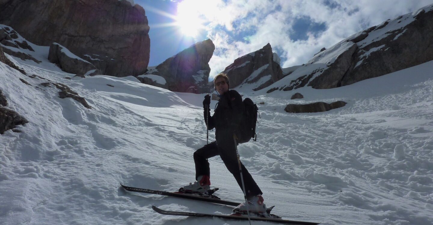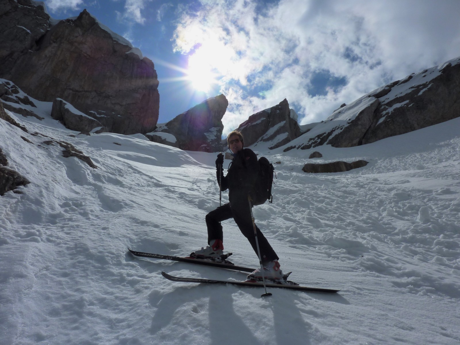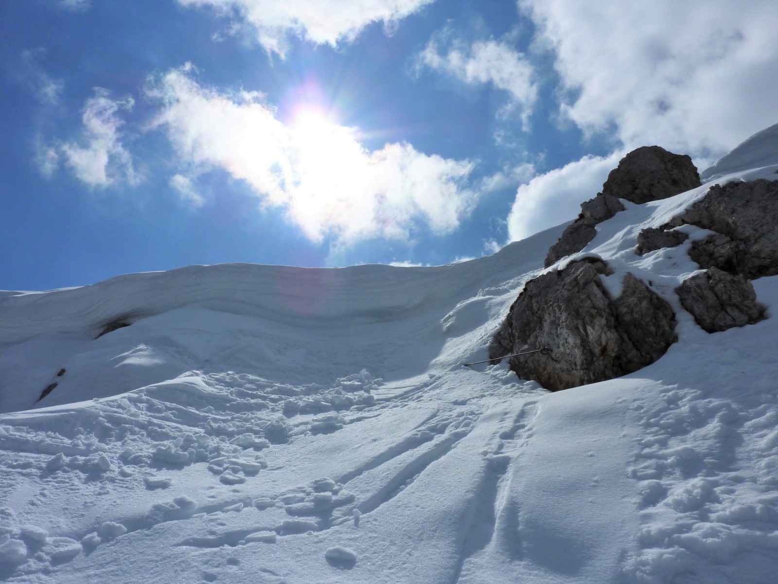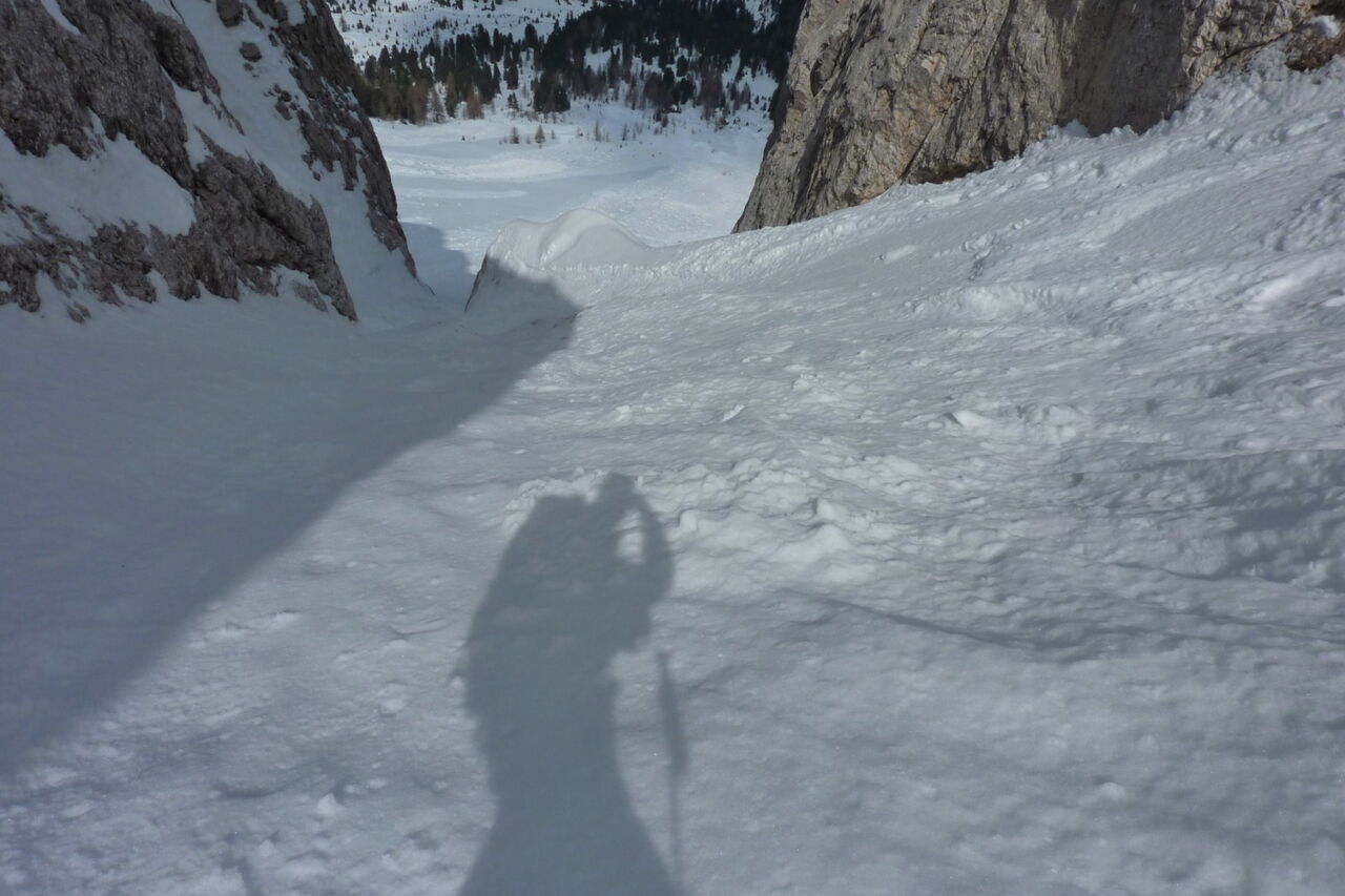 An der Bergstation des Lifts Nr. 8 Fermeda fahren wir 700 m in östlicher Richtung, den Hang querend, wo wir beim Einstieg in die Scharte eine 2 bis 3 m hohe Schneewechte überwinden mussten.