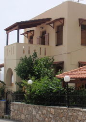 Bis Apodoulou gehen wir 3 km auf einem aussichtsreichen Höhenweg. Die Schotterpiste geht in eine betonierte Piste über und wir erreichen eine Kreuzung mit Asphaltstraße. Dann gehen wir rechts oberhalb des Ortes Apodoulou weiter. Kurz hinter einem riesigen Eukalyptusbaum gehen wir bei der Weggabelung rechts. Vorbei kommen wir an den Überresten eines Fußballplatzes, einem Abzweiger nach links, den wir ignorieren, und einem großen weißen Gebäude. An der folgenden Weggabelung gehen wir bei dem gelben Haus mit den grünen Fensterläden halb rechts. In der Ortschaft Nithafri halten wir uns bei der Weggabelung nahe der Hausnummer 187 halb rechts und kommen schließlich an einer links liegenden 04 Kirche (487 m) vorbei.