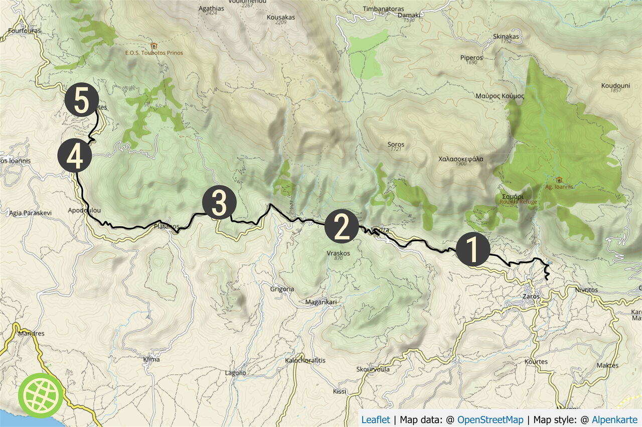 Charakter: Die längste Wanderung dieses Wanderführers. Extrem hoher Navigationsaufwand aufgrund der vielen Wegverzweigungen. Art des Weges: 50 % Schotterpiste und 50 % Asphaltstraße. Zusatzausrüstung: keine. Einkehr: Taverne Paradosi nach 10 km beim botanischen Garten. Beste Wanderzeit: ganzjährig. Variante: Leider gibt es bis heute keine Unterkunft zwischen Zaros und Kouroutes. Alternativ kann man die Strecke mit dem Taxi fahren.