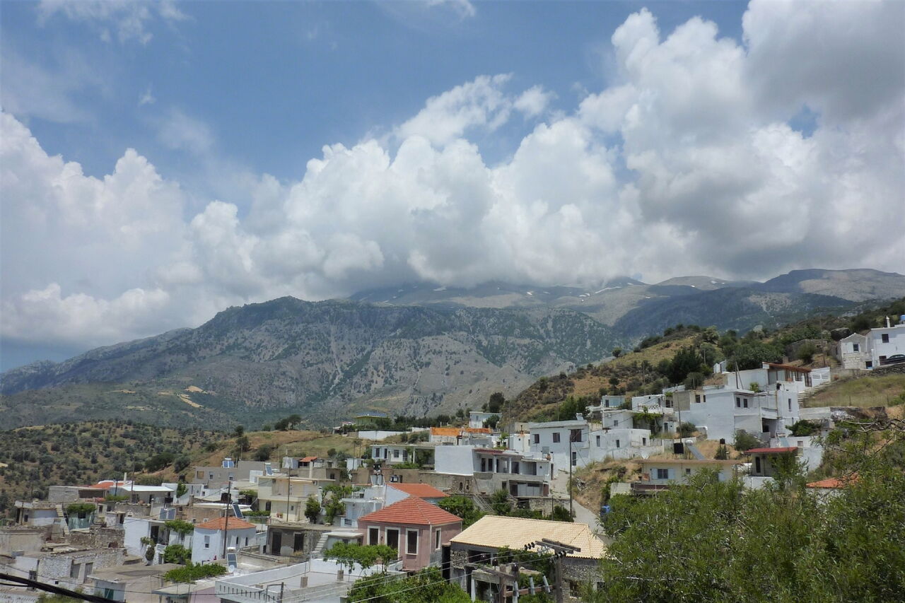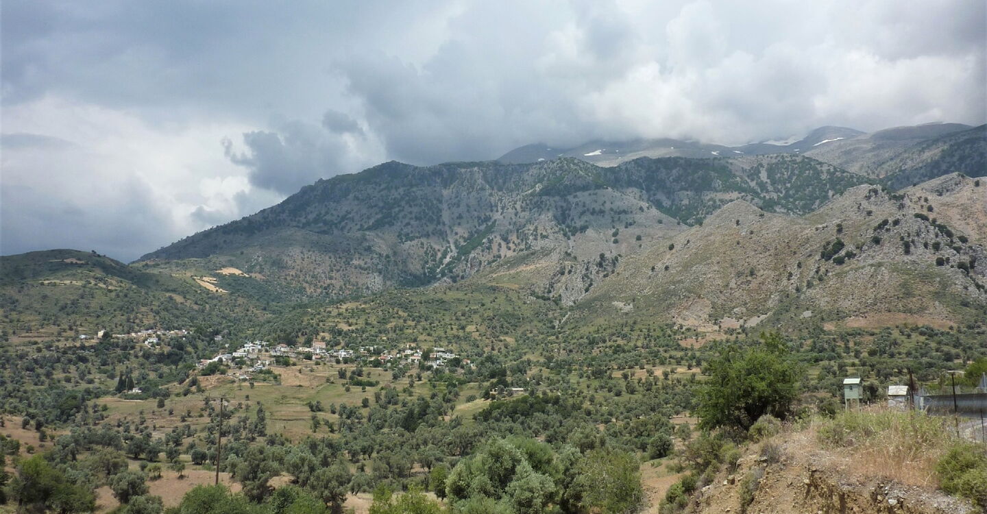 Wir gehen 850 m auf der Asphaltstraße und verlassen diese in der Rechtskehre auf den halb links beginnenden Schotterpfad. Bei guter Sicht haben wir von dieser Position einen atemberaubenden Blick auf den Psiloritis. Auf der anderen Talseite sieht man unser heutiges Tagesziel, die Ortschaft Kouroutes. Beim Dorfplatz mit den Informationstafeln gehen wir links auf der Straße noch durch die nachfolgende Kehre, biegen dann die zweite Straße links ab, anschließend sofort wieder rechts und erreichen nach 80 m die Unterkunft 05 Χenonas Kourites (535 m).