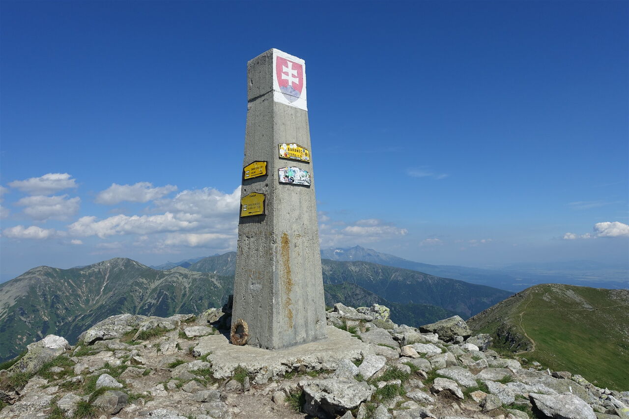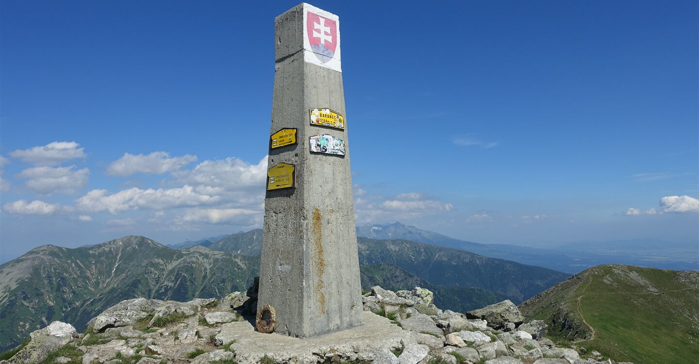 Auf einem schmalen, aber nicht ausgesetzten Berggrat geht es zunächst zu einer Einsattelung bergab, bis dann der finale Aufstieg zum 04 Baranec (2148 m) folgt. An wenigen Stellen muss man die Hände zu Hilfe nehmen. In kleinen Kehren geht es auf rutschigem Untergrund steil bergauf bis zum großen betonierten Gipfelkreuz. Die 360°-Panoramasicht ist einfach faszinierend.