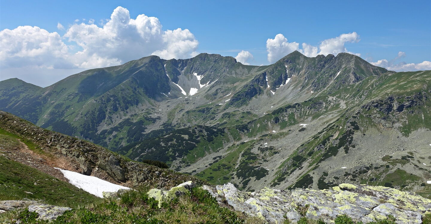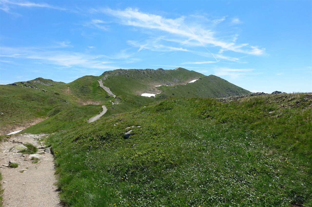 Ein breiter ausgetretener Pfad ist weithin sichtbar. Wir erreichen den Berg 03 Smrek (2072 m), bei guter Fernsicht schaut man auf die nordwestlich gelegenen Bergspitzen Prislop, Banikov, Hruba kopa und Trio kopy. Über diese führt der Klettersteig, wie in Wanderung 31 beschrieben.