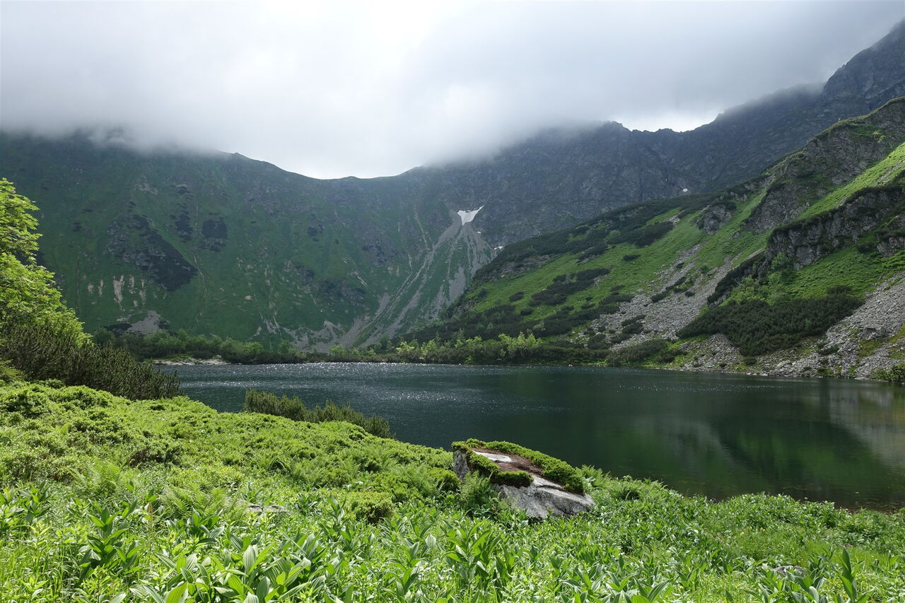 Auf einem angelegten Pfad steigen wir weiter auf und kommen am dritten, vierten und letzten der 04 Roháče plesá (1683 m) vorbei. Wir haben den höchsten Punkt der Tour erreicht, von nun an geht es steil und in engen Kehren auf einem blau ausgezeichneten Wanderweg talwärts. Wir ignorieren den linken Abzweiger Richtung Žiarska Chata (siehe Touren 31 und 32).
