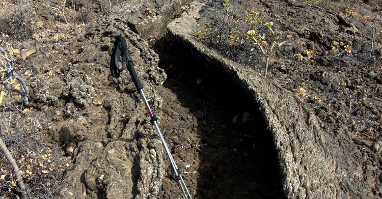 Ja, eigentlich ist es nur ein Loch im Boden und außerdem ist es auch nur sehr schwer zu finden. Also warum diese Exkursion? Die Fundstellen befinden sich nördlich von San Andrés, auf der zentralen Hochebene gelegen, westlich unterhalb des 1.176 m hohen Vulkans Montaña del Jablito. Wir suchen nach 80–100 cm großen runden Löchern im Boden, diese befinden sich 3–4 m und 10–15 m links neben der Piste. Der Vulkan steht auf der rechten Seite, wir sind von San Andrés gekommen. Obwohl an dieser Stelle kein Zaun vorhanden ist, betritt man ein Privatgrundstück, das jederzeit verlassen werden muss, wenn der Eigentümer darauf hinweist. Vor ca. 2.500 Jahren ereignete sich ein kleiner Vulkanausbruch, bei dem Lava um die dort stehenden Bäume herumfloss. Der Lavastrom erstarrte, noch bevor die Bäume vollständig verbrannten. Die Bäume gibt es schon lange nicht mehr. Was blieb, sind die 80–100 cm großen kreisrunden Löcher. Beim genaueren Betrachten ist sogar noch der Abdruck der Rinde zu erkennen – wie ich meine, eine geologische Sehenswürdigkeit. | GPS-Koordinaten 27.774546 ‑17.955058 | siehe Wanderung 30* |