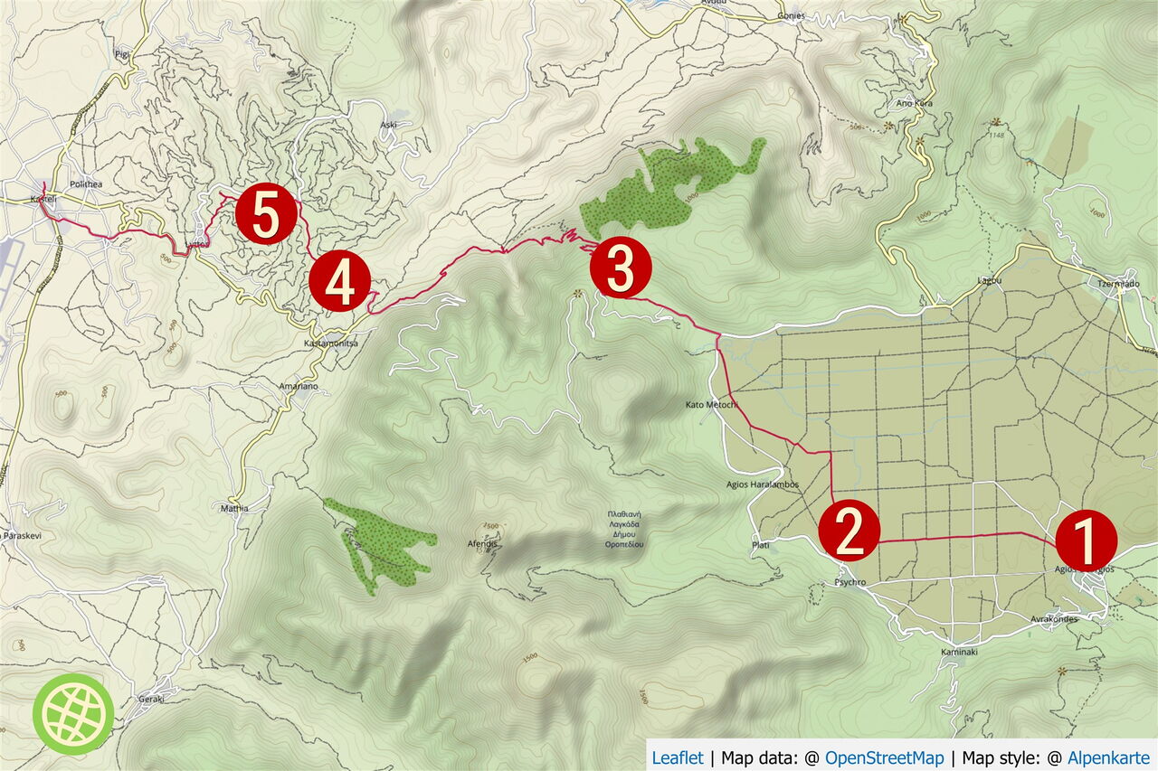 Charakter: Über 20 km Entfernung, aber nur 300 Höhenmeter Aufstieg, keine technischen Anforderungen und einfache Orientierung im Gelände erwarten uns heute. Art des Weges: 15 % Asphaltstraße und 85 % Schotterpiste. Zusatzausrüstung: keine. Einkehr: keine auf der Wanderung. Beste Wanderzeit: Mai bis Oktober. Variante: Besucht man noch die Zeushöhle, so verlängert sich die Gesamtstrecke um 3,4 km und der An- sowie Abstieg um 167 m.