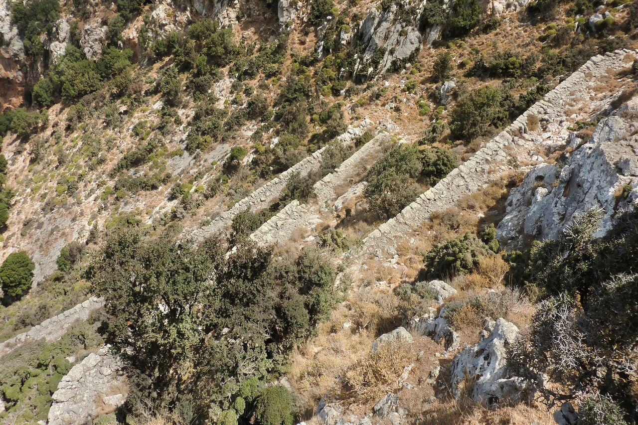 Hinter einer kleinen Schlucht erreichen wir eine Weggabelung, gehen geradeaus weiter und lassen das Haus rechts von uns liegen. Die Piste geht in einem Pfad über, wir passieren ein Ziegengatter und steigen bergauf, bis wir wieder auf eine Schotterpiste gelangen. Nach 250 m, in einer Linkskehre der Piste, verlassen wir diese nach rechts und gehen fortan auf dem äußerst beeindruckenden 03 Minoan Path (928 m). Dieser schraubt sich, ohne Ablass, in langen Kehren Richtung Tal – und das tut er schon seit mindestens 3000 Jahren! Bei guter Sicht kann man die vorgelagerte Insel Dia, einen Stausee und die komplette Tiefebene an der nördlichen Küste von Kreta ausmachen.