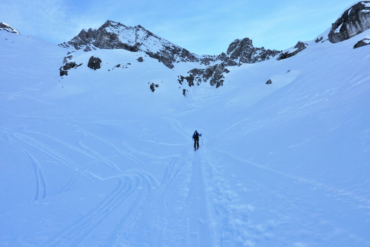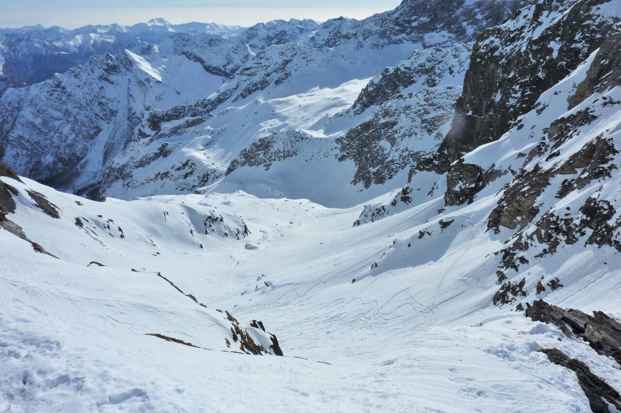 Am Passo Coppa ist der Einstieg in die Abfahrt über eine Strecke von 150 m steil. Dann halten wir uns rechts. Das Tal öffnet sich und unverspurte Tiefschneehänge liegen vor uns.