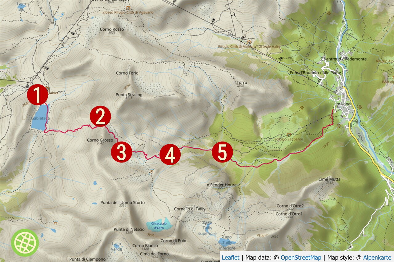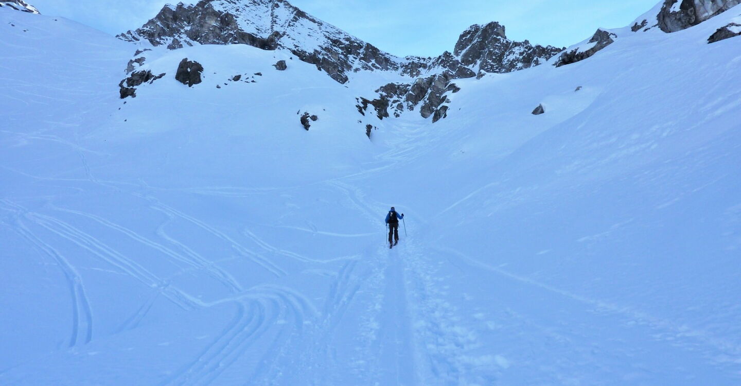 Nach einem kurzen Aufstieg und einer Abfahrt mit dem Ziel vor Augen kommt man wieder ins Skigebiet zurück. Die Abfahrt führt über einen Osthang. Folgende Ausrüstung wird empfohlen: Produkte für alpine Sicherheit im Schnee, Tourenski und Skitourenhelm. Es gibt keine Einkehr auf der Tour. Außer man nimmt vor oder nach der Tour eine Stärkung in dem Rifugio Città di Vigevano. Beste Jahreszeit: Januar bis Mitte März. Uns erwarten kurze Stücke mit bis zu 35° Hangneigung.