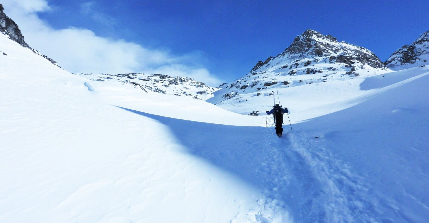 Wenn der Weg bereits gespurt ist, können wir die Ski schultern; sonst ist Auffellen angesagt. Nach dem Passo Zube halten wir uns rechts, auf die Ausläufer vom Punta di Straling zu.