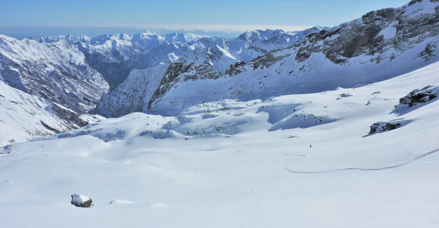 Der Einstieg zum Aufstieg ist nicht leicht zu finden. Sonst ist mithilfe des GPS-Tracks auf der Abfahrt die Orientierung einfach. Die Abfahrt führt über einen Südosthang. Folgende Ausrüstung wird empfohlen: Produkte für alpine Sicherheit im Schnee, Freerideski und Skitourenhelm. Es gibt keine Einkehr auf der Tour. Außer man nimmt vor oder nach der Tour eine Stärkung in dem Rifugio Città di Vigevano. Beste Jahreszeit: Januar bis Mitte März. Uns erwarten kurze Stücke mit bis zu 35° Hangneigung.