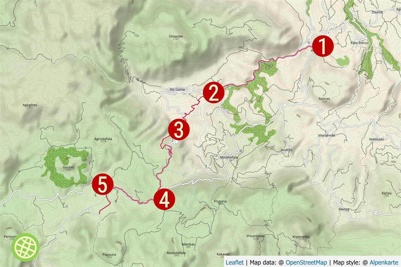 Am Hauptplatz von 01 Argiroupoli (600 m) mit der Kirche und dem Torbogen gehen wir die Asphaltstraße in das Unterdorf hinunter. Wir erreichen nach 120 m einen weiteren Platz, gehen links an dem Haus mit den braunen Fensterläden vorbei und in die Gasse hinunter. Bei der folgenden Weggabelung halten wir uns rechts und nach 60 m abermals rechts. Wir befinden uns nun auf einem steil bergab führenden Pfad zu den Quellen Agia Dynami des Mouselas-Flusses. An der Asphaltstraße angekommen, gehen wir links. Nach 500 m endet diese, wir gehen nun links auf der relativ unbefahrenen Straße durch eine enge Schlucht parallel zu einem Flussbett.