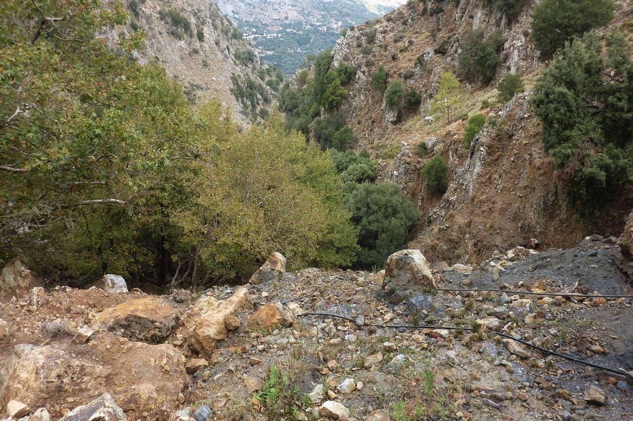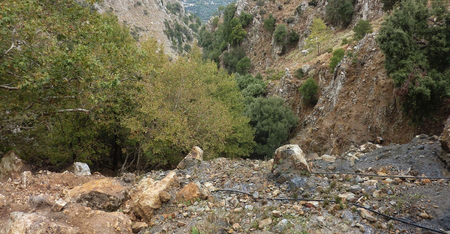 Wir gehen links bis zu einer Linkskehre der Straße und befinden uns nun kurz vor einem Gebäude mit dunkelgrauen Türen. Dort zweigt nach rechts eine Schotterpiste ab. An dieser Stelle kann man bequem, aber länger, auf der Straße weitergehen, oder man folgt der beschriebenen 03 Variante (468 m). Die Piste geht schnell in einen Pfad über, dabei steigen wir zunächst einige Meter ab. Zwischen Felswand und kleinen Bäumen führt ein Pfad kontinuierlich bergauf. Im weiteren Verlauf ist der Pfad schwerer auszumachen, wir orientieren uns an den vielen schwarzen Wasserschläuchen. Schlussendlich geht es die letzten 150 m etwas beschwerlich durch das Schotterfeld des Bachbettes. An einer flacher werdenden Stufe angekommen, halten wir uns halb links. Wir orientieren uns an der Grenze zwischen Bäumen und Feldern und erreichen eine Piste, auf der wir wieder auf die Asphaltstraße gelangen.