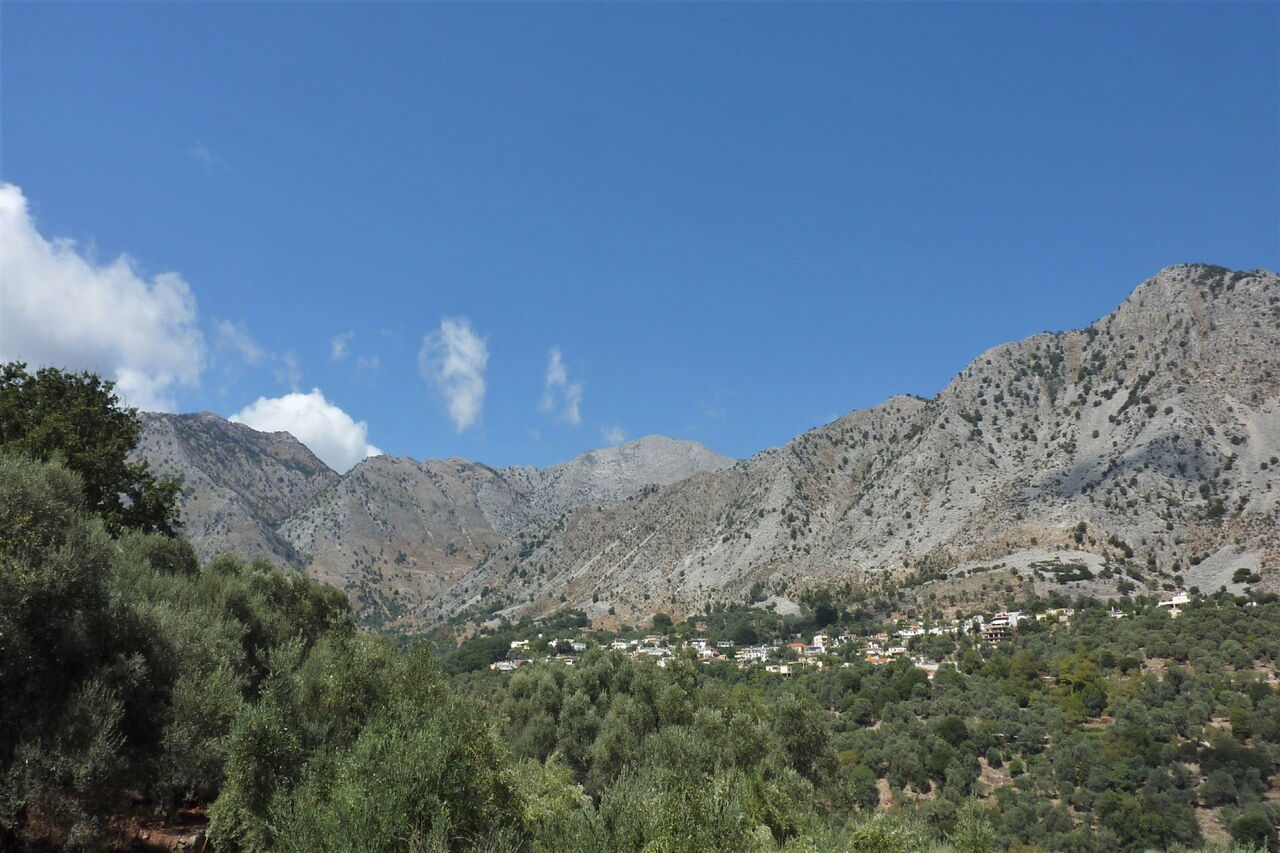 Wir laufen auf einem Wegstück, an dem die Straße eine neue Asphaltdecke bekommen hat, links befindet sich ein graues Gebäude, das wie ein Bunker aussieht, mit einem Oleander und einer Platane. An dieser 02 Schlüsselstelle vor Asi Gonia (267 m) biegen wir links in die asphaltierte Piste ein, die nach einigen Metern schon in eine Schotterpiste übergeht. Wir passieren den Ziegenzaun und gehen parallel zu dem aufgeschütteten Steinwall quer über das Feld, bis wir bei Bäumen ein Trockenbachbett erreichen. Wir gehen rechts im Bachbett, nach einigen Metern gehen wir bei der Bachbettgabelung rechts und im Folgenden 400 m durch das Bachbett. Nach 400 m beginnt rechts auf der Böschung ein Weg, der uns zu einer Brücke führt. Wir queren die Brücke nach links und folgen sofort dem rechten Abzweiger. Auf Wirtschaftswegen geht es bergauf bis zur Asphaltstraße.