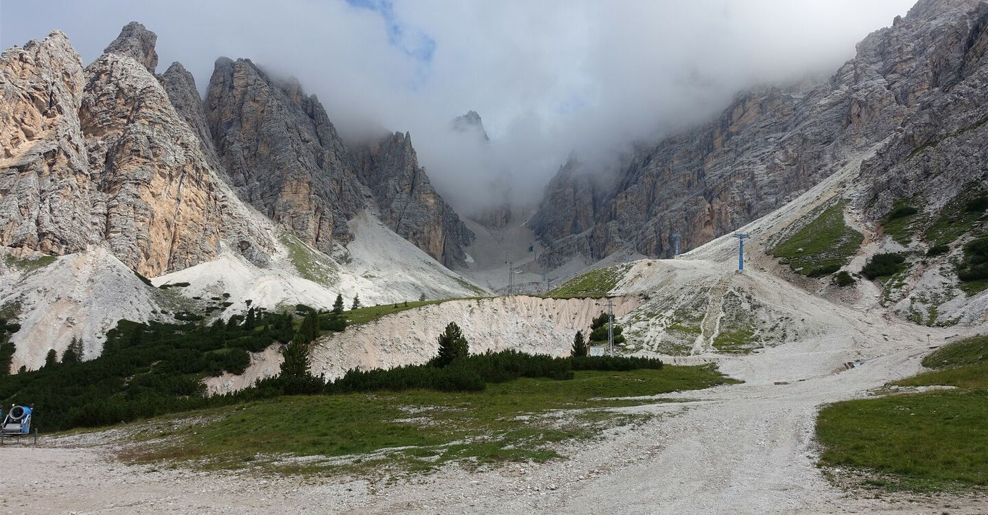 Einen linken Abzweiger zum Via Ferrata Dibona und den darauffolgenden rechts abzweigenden Forstweg über die Brücke ignorieren wir. In einem wunderschön gelegenen Hochtal unterhalb der Gipfelwelt der mächtigen Spitzen der Cristallogruppe marschieren wir an einer Ruine und einem Heiligenschrein vorbei. Wir ignorieren weitere abzweigende Pfade, queren ein Bachbett und unterqueren den Skilift Padeon. Auf einem Fahrweg geht es links neben der Skipiste bergauf, dann queren wir die Skipiste nach halb rechts und kommen an einem künstlich angelegten See vorbei. Wir ignorieren abzweigende Pfade und gehen bis zum Passo Son Forca. Von dort kann man direkt mit dem Abstieg beginnen. Ein lohnenswerter Abstecher ist das oberhalb liegende 03 Rifugio Son Forca (2.235 m). Auf dem Weg dorthin blickt man direkt auf die faszinierende Cristallo-Scharte, gelegen zwischen dem Piz Popena und dem Monte Cristallo.
