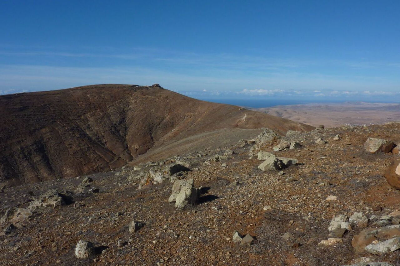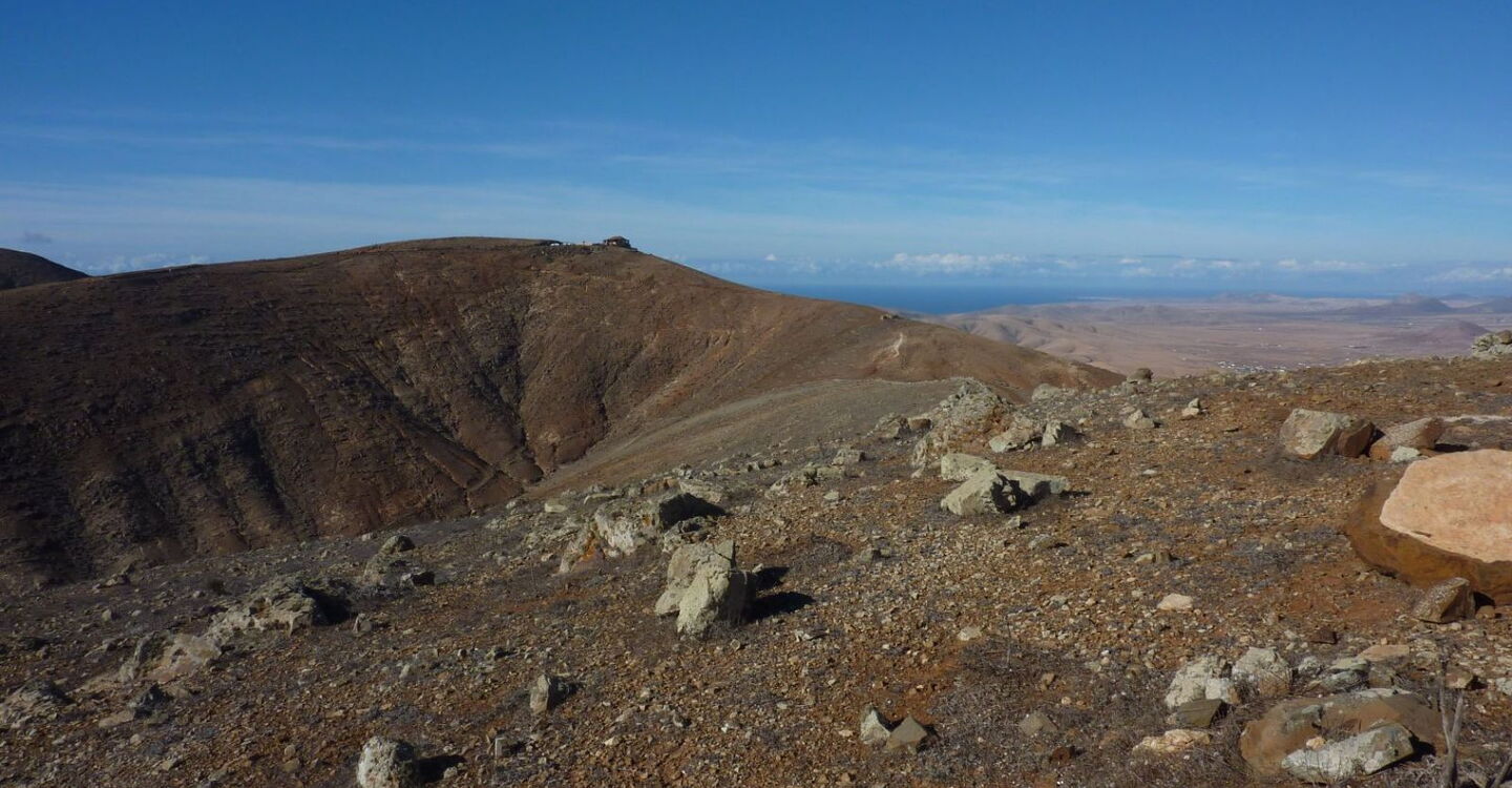 Nach 1,7 km Gesamtwegstrecke erreichen wir ein Picknickhaus mit Sitzplätzen und Windschutz an der (02) Degollada Vieja (580 m). An dieser Stelle verlassen wir den Fernwanderweg, der Richtung Süden weiter nach Vega de Rio Palmas führt. Wir wandern links Richtung Norden an einer Steinmauer entlang und halten dabei auf die vor uns liegende Montana Tegu mit 645 Höhenmetern zu. Schaut man Richtung Osten in das Tal herunter, so kann man den Ort Antigua mit seinen 3.000 Einwohnern sehr schön sehen. Gegründet 1485, war der Ort bis 1833 die Hauptstadt von Fuerteventura, bis das Amt an Puerto del Rosaria weitergegeben wurde.