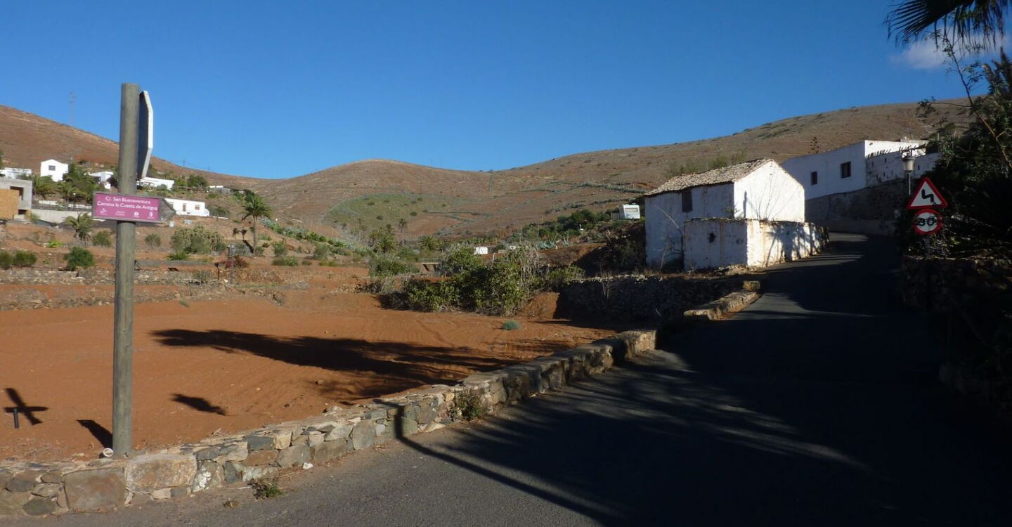 Vom Parkplatz und (01) Start (392 m) am südlichen Ortsende Betancurias gehen wir bis zur Durchgangsstraße vor und folgen dieser 120 m nach links. Wir richten uns anschließend nach dem Wegweiser Richtung Camino Betancuria – Degollada Vieja – Antigua and SL FV29. Das folgende Wegstück bis zur Anhöhe gehört zum europäischen Fernwanderweg Camino Naturale de Fuerteventura GR-131. Dieser durchquert Fuerteventura von Nord (Corralejo) nach Süd (Jandia). Die Asphaltstraße geht in eine Schotterpiste über und schon bald hat man einen wunderschönen Blick auf das Bergdorf.