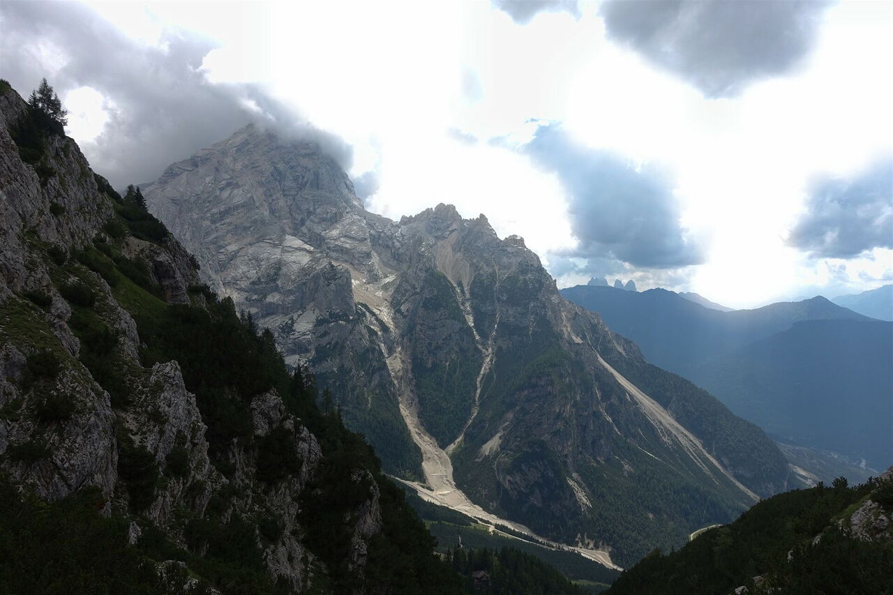 Der schmale Pfad geht in einen breiteren Pfad über und wir erreichen das Reich der 04 pino mugo (2.026 m) (Latschenkiefern). Unterhalb von uns kann man bereits das Rifugio San Marco sehen, dahinter erhebt sich imposant der Berg Antelao.