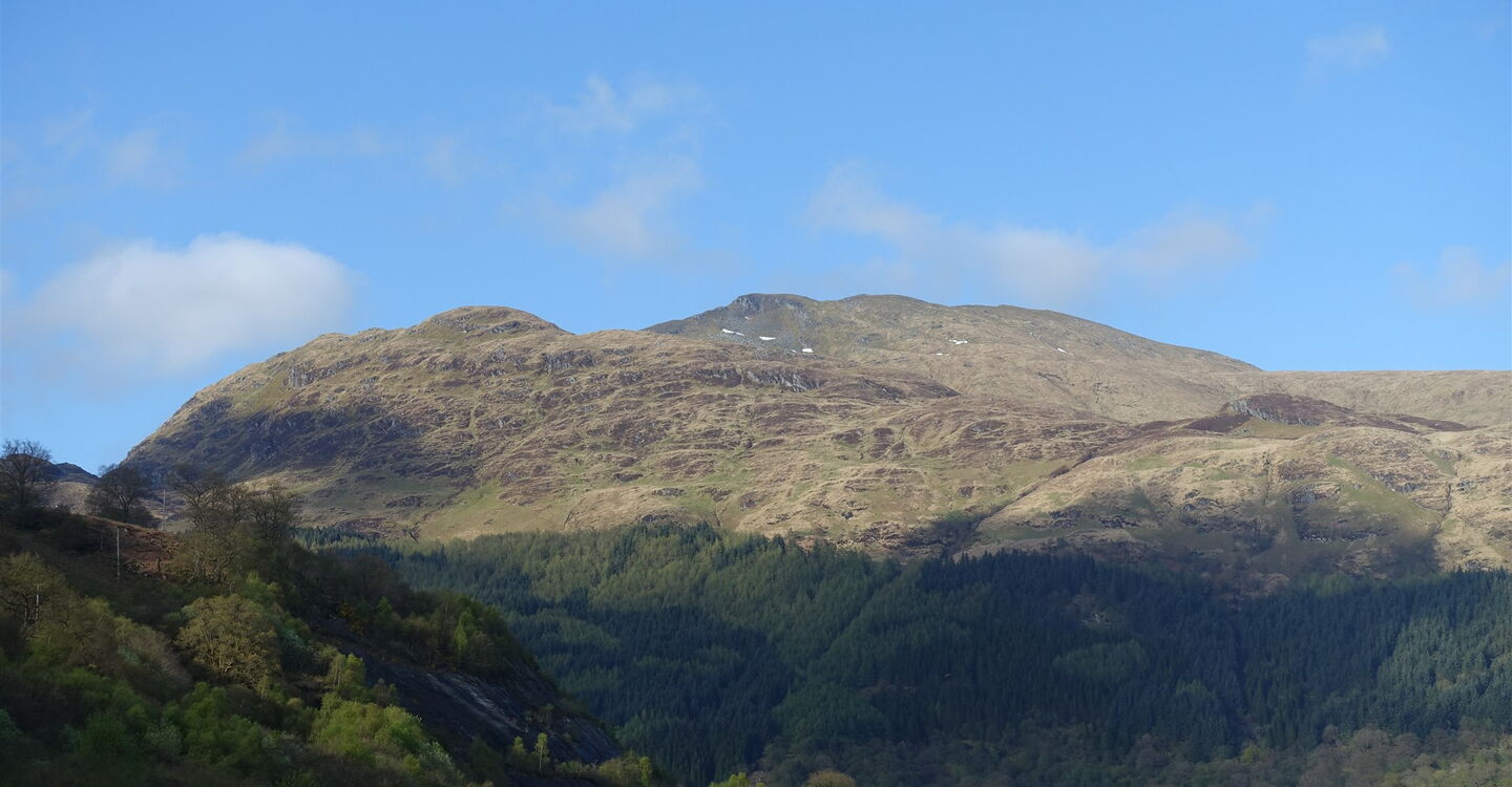 Zunächst geht es durch einen Eichenwald, dann passieren wir ein 02 Gatter (194 m) und kurz später queren wir eine Forststraße. Schon bald lassen wir die Bäume hinter uns, der Blick ist frei in Richtung des Ben Lomond. Wir passieren im Folgenden ein weiteres Gatter. Noch in den Neunzigerjahren war der nachfolgende Aufstieg bis zu 25 m breit und die Oberfläche stark erodiert. Dann legte der National Trust den heutigen ausgezeichneten Weg an, der nur noch ein paar Meter breit ist, sodass die Natur sich erholen konnte. Stand 2018 betreute der National Trust 46 Wanderwege in Schottland. Nach 3,35 km erreichen wir einen schönen Aussichtspunkt, den kleinen Gipfel des Sron Aonaich (577 m).