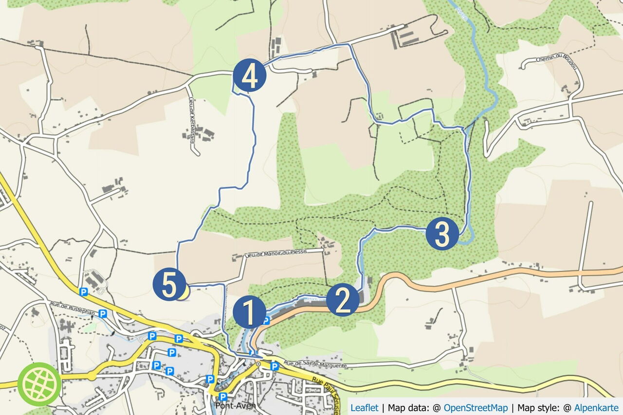 Spaziergang auf angelegten Pfaden für die ganze Familie. Art des Weges: 30 % Straße und 70 % Pfad. Zusatzausrüstung: Keine. Einkehr: Auf der Wanderung keine, aber im Ortszentrum von Pont-Aven befindet sich das Restaurant Le Moulin de Rosmadec mit dem Chefkoch Frédéric Sébilleau. Klingt teuer, ist teuer und ist sehr gut. | Geokoordinaten 47.855285 -3.748040 | Beste Wanderzeit: Ganzjährig. Sehenswert Region: Nur 800 m entfernt befindet sich das Musée de Pont-Aven – in Paul Gauguins Künstlerdorf, GPS zu Fuß 47.856368 -3.745480.
