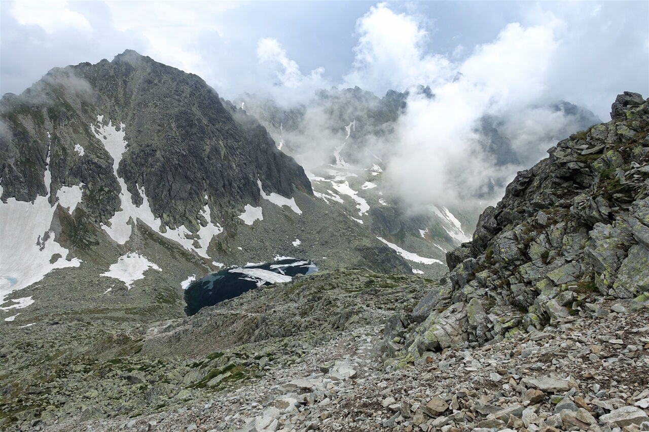 Der finale Aufstieg zur Einsattelung ist extrem steil, selbst im Juni befinden sich hier noch Restschneefelder, die gequert werden müssen. Da die Route jedoch oft begangen wird, ist meist eine ausgetretene Spur vorhanden und Steigeisen sind in der Regel nicht notwendig. Die letzten Meter bis zum 03 Bystrá lávka (2300 m) sind dann mit einer Kette gesichert. Durch eine Felsspalte schlüpft man auf die andere Seite des schmalen Grats. Sehr spektakulär! Bei guter Sicht schaut man direkt in die Gipfelregion des 2494 m hohen Berges Kriváň, dem Nationalsymbol der Slowakei. Siehe Wanderung 38.