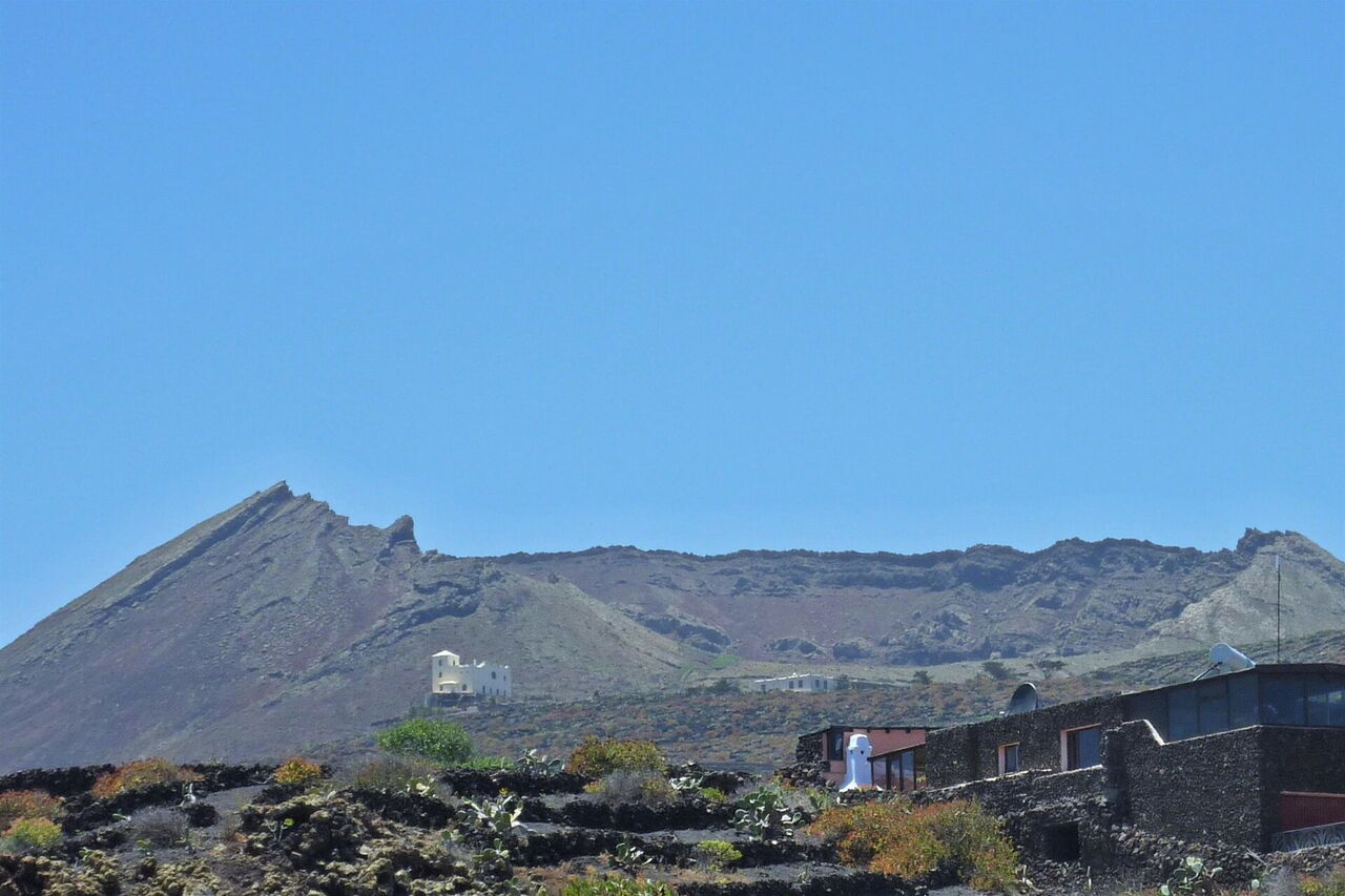 Schaut man vom 01 Parkplatz Ziel und Start 15 m landeinwärts, so sieht man auf der rechten Seite sehr schön die Ausläufer des Famara Gebirgsmassivs sowie auf der linken Seite den offenen Kegel des Vulkans Monte Corona. Prinzipiell kann man gerade über die Straße gehen und den beginnenden schmalen Pfad an den Strandabschnitt nehmen.