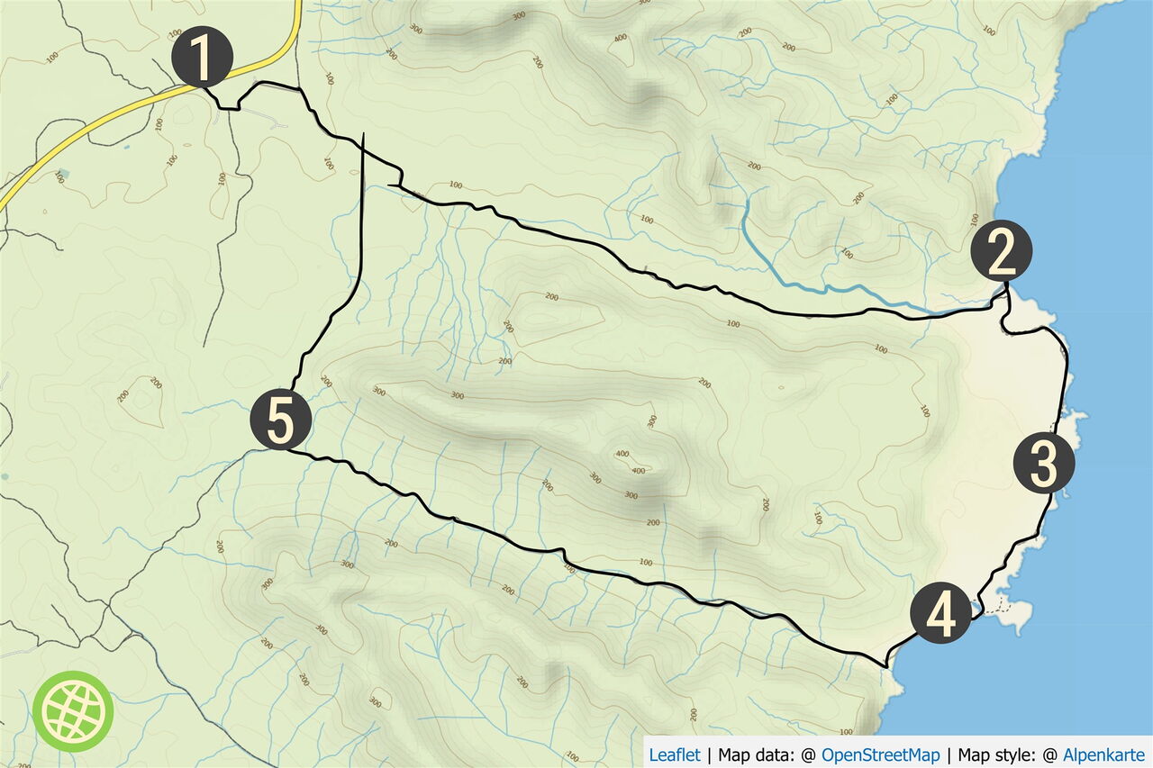 Vom (01) Start und Ziel an der FV-2 (89 m) führt unser Weg vorbei an der Biofarm, um nach 230 m – links am Wegesrand steht eine Norfolktanne – rechts in die Schotterpiste einzubiegen. Nach 300 m endet der Weg. Wir halten uns rechts und erreichen eine Anhöhe und Weggabelung. Die rechte Piste ist unser Rückweg, wir gehen links weiter. Vorbei geht es nun an einem Gambuesa, bevor der Weg anfängt, sich Richtung Atlantischer Ozean zu neigen.