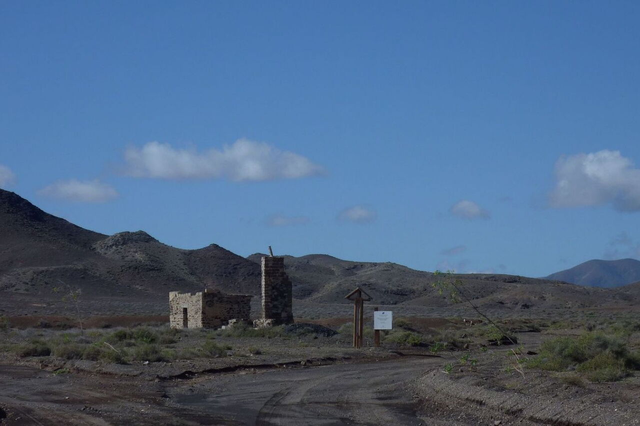 Ganz am südlichen Ende der Bucht beginnt der Rückweg durch das (05) Barranco Jacomar (151 m). Es folgt ein langer monotoner Weg. Hier hat man Zeit, um Ausschau zu halten: Vielleicht lässt sich ein sehr seltener Schmutzgeier erspähen. Das Gefieder des Schmutzgeiers ist weiß mit schwarzen Schwungfedern, die Spannweite beträgt ca. 1,65 m. Diese Tiere leben bevorzugt in abgelegenen Seitentälern von Fuerteventura. Auf jeden Fall sehen wir bald in der Ferne die Silhouette eine Ruine, an der wir rechts gehen und die Weggabelung vom Hinweg erreichen.