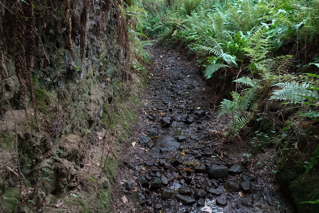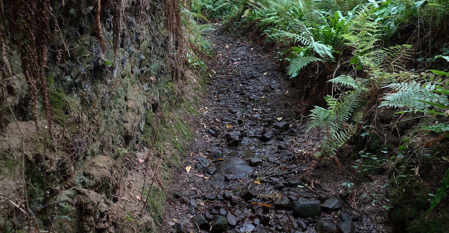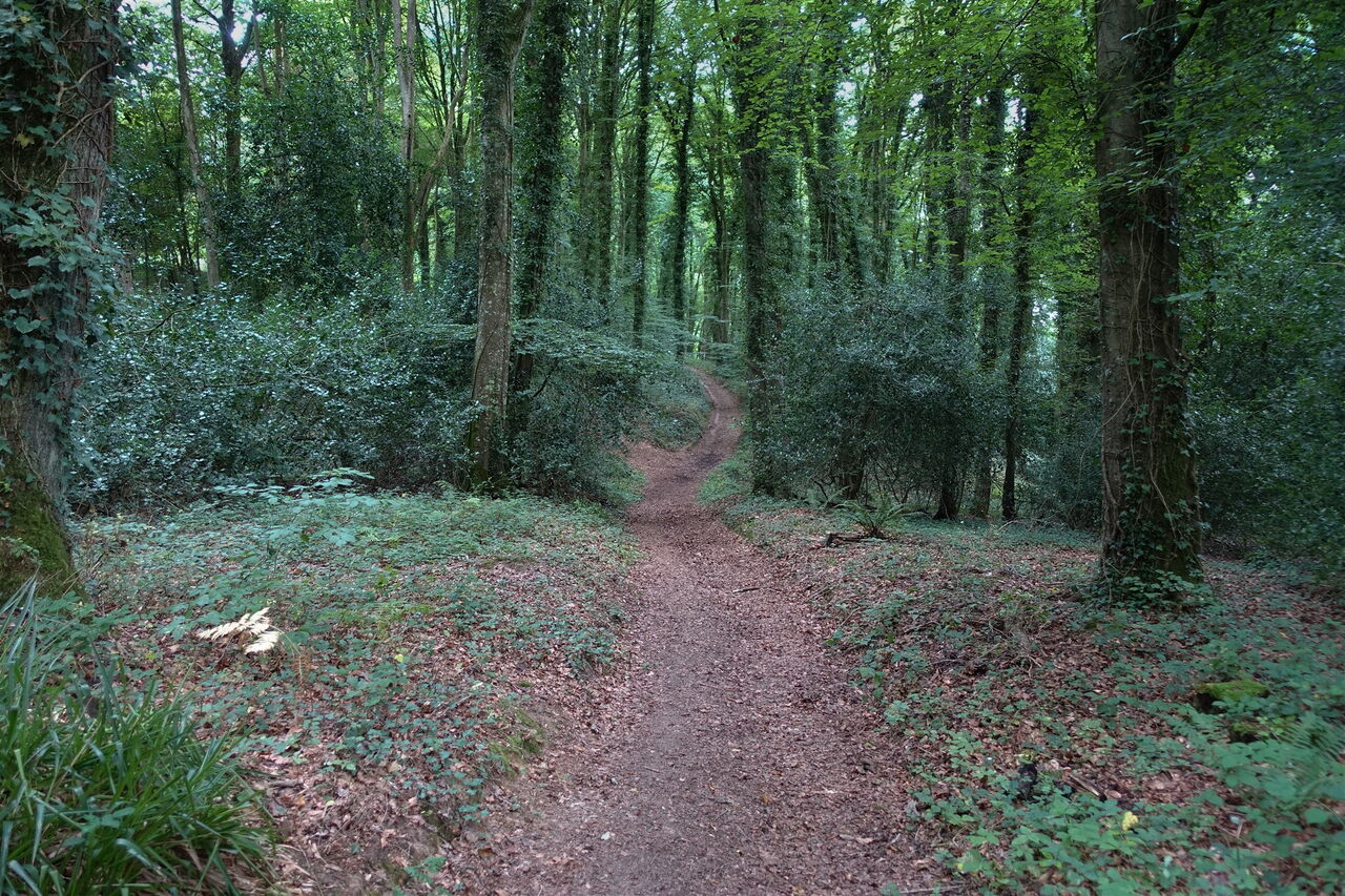 Der Aufstieg erfolgt entlang eines Bachlaufes und wir queren eine Piste. Sobald wir halb rechts ein Haus sehen, gehen wir auf dieses zu, biegen dann aber vor der Steinmauer halb links auf einen schmalen und meistens feuchten Pfad ab, der durch den 05 Wald de la Roche-Jagu (52 m) führt. Der Pfad mündet in einen Wirtschaftsweg. In der nachfolgenden Rechtskehre des Weges gehen wir aber geradeaus auf einem Pfad weiter. Die folgende Kreuzung überqueren wir und je nachdem, wo wir geparkt haben, gehen wir rechts zum Parkplatz und Ausgangspunkt.