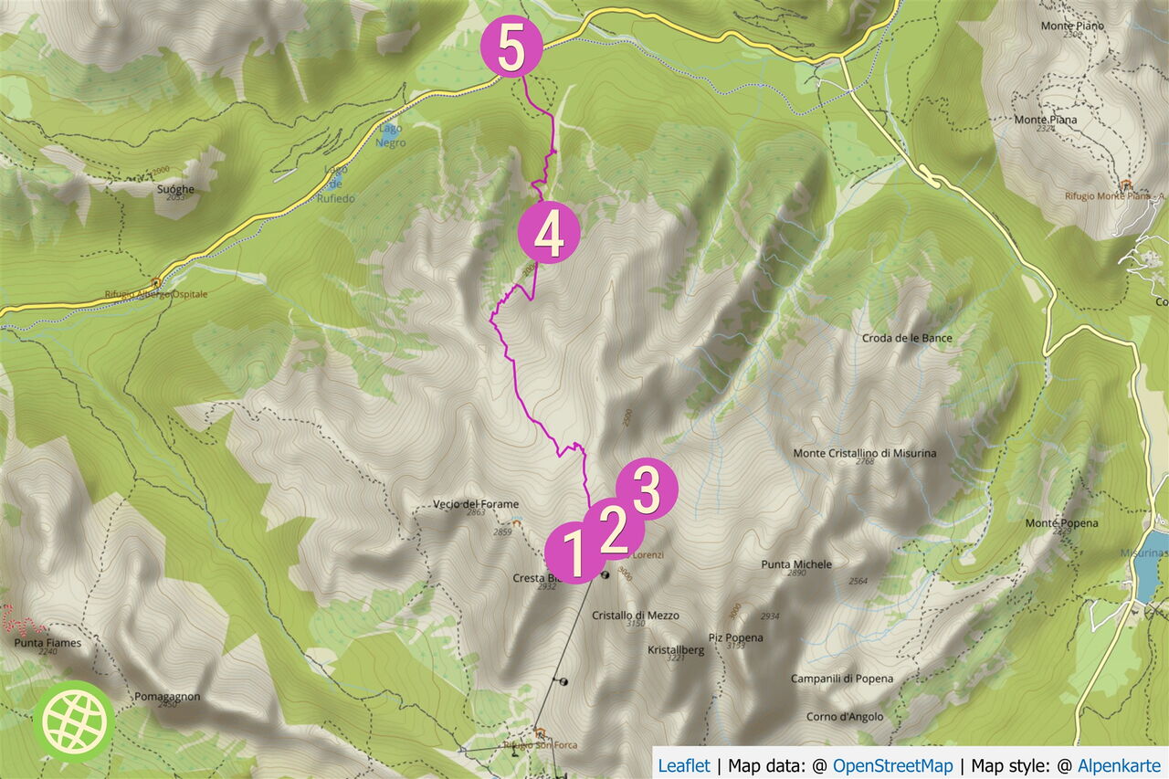 Geokoordinaten zum Start 46.551117 12.189233. Sie führen Dich nach Cortina, wo Du das Auto parkst und nun mit dem Lift weiter fährst.