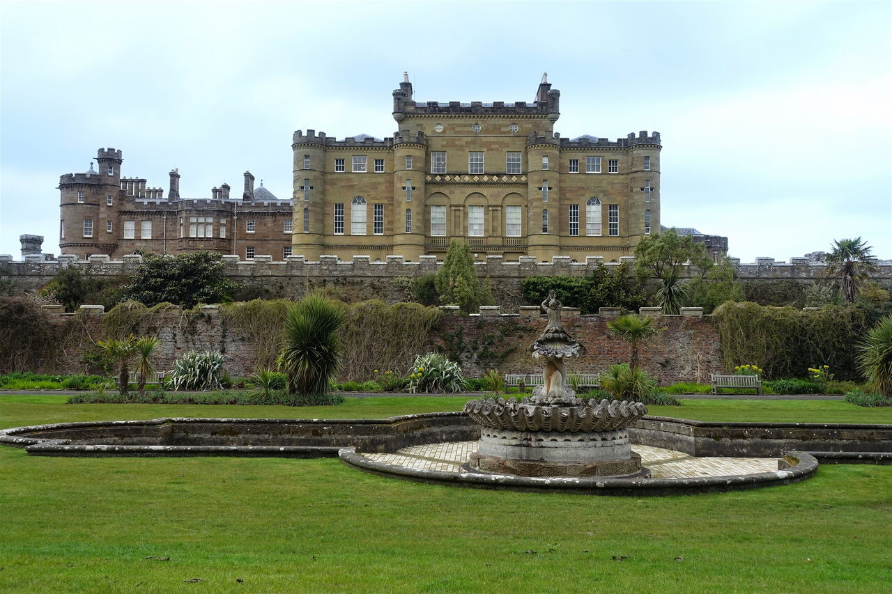 Wir gehen am Strand entlang, kommen an einer Felsnase vorbei und nehmen an dem alten Bootshaus den Pfad mit einem Geländer bis zu einer Geschützgruppe. Bei den Kanonen gehen wir links, queren die vor uns liegende Rasenfläche zu einem Mauerdurchlass und kommen an der Orangerie und den Gärten mit einem riesigen Springbrunnen vorbei, direkt vor dem 03 The Culzean Castle (27 m). Es wurde im 18. Jahrhundert von Robert Adam – man sagt, es sei sein letztes großes Meisterwerk – für David Kennedy, den 10. Earl von Cassillis, als romantisches Schloss entworfen. Im Jahr 1945 wurde das Castle an den National Trust for Scotland (NTS) übergeben, der es bis heute vermarktet und unterhält.