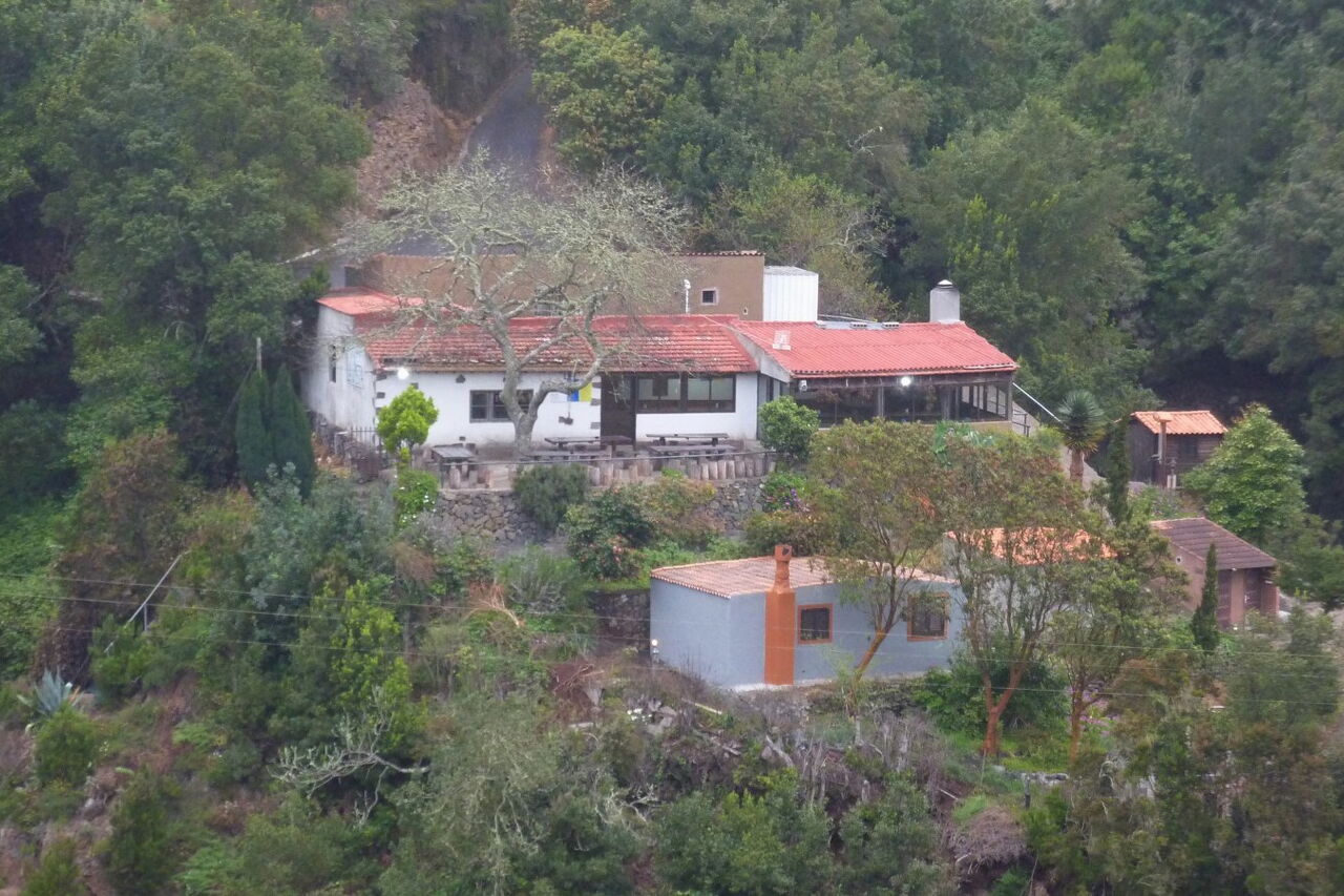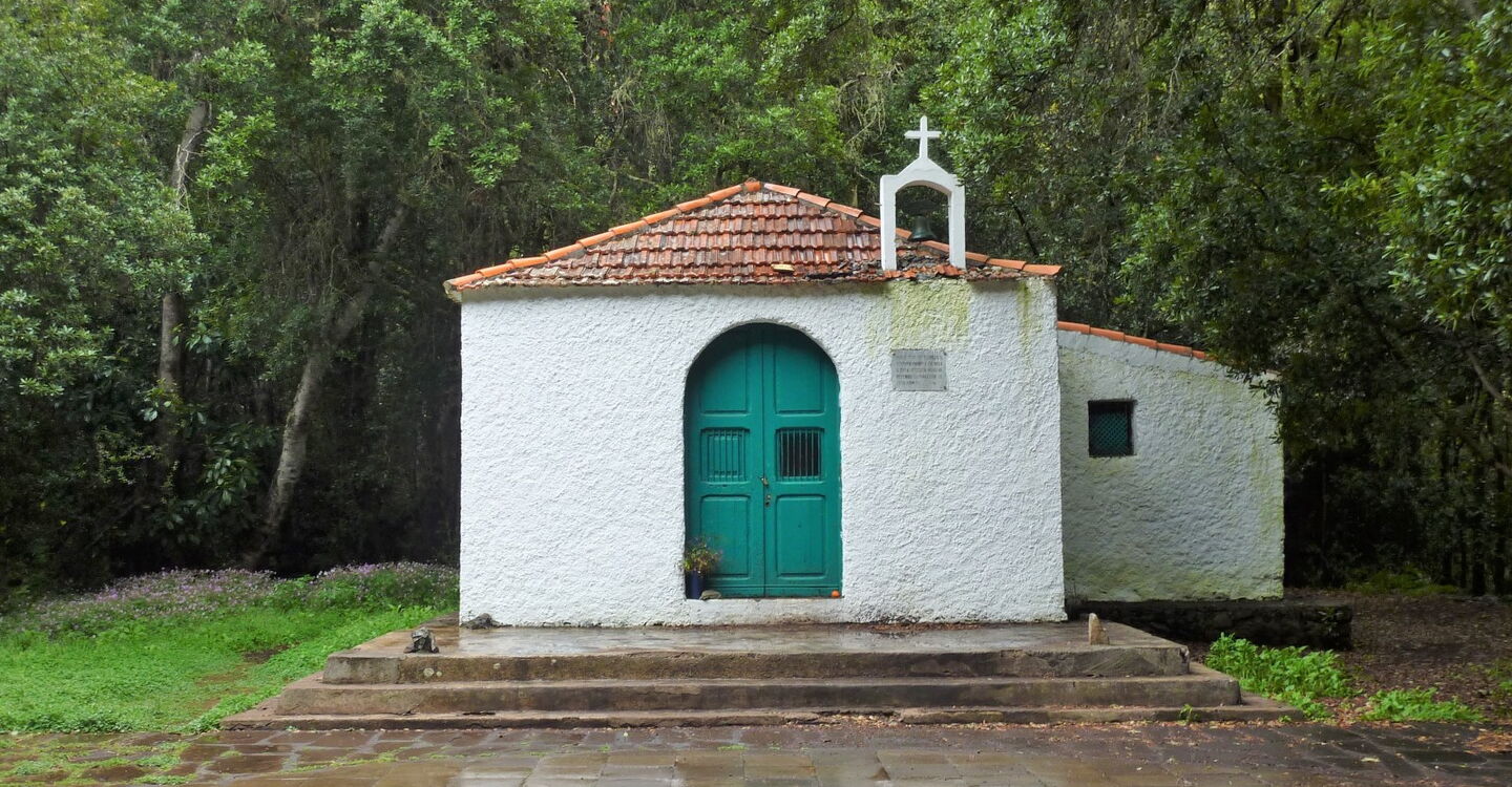 Bereits nach einigen Metern verlassen wir die Fahrstraße nach links und erreichen die (04) Ermita de Lourdes (969 m). Vom kleinen Kirchplatz führt halb links ein Weg direkt zum Weiler El Cedro - dies ist die Variante, um den Wasserstollen zu umgehen. Wir gehen jedoch auf dem etwas erhöhten Weg in nördliche Richtung weiter durch den Nebelwald, um bei der Fahrstraße rechts zu gehen und den folgenden Abzweiger nach rechts zu ignorieren. In einer scharfen Rechtskurve verlassen drei Wanderwege die Fahrstraße nach links. Wir begehen den rechten dieser Wege Richtung Hermigua und steigen zunächst durch den Wald ab.