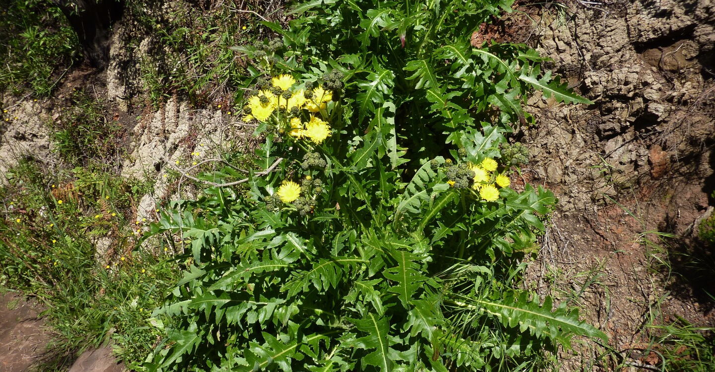 Wir erreichen die GM-2, gehen ein kurzes Stück auf dem beginnenden Forstweg nach links, um dann sofort (02) rechts (1331 m) auf dem hier beginnenden Pfad Richtung Laguna Grande weiterzugehen. Auf dem folgenden Wegstück würden wir normalerweise durch einen dichten Nebelwald gehen, aber nach den letzten Waldbränden wurde dieser leider komplett zerstört - geblieben sind nur die schwarzen verbrannten Stummel. Dieser Umstand gibt wiederum dem Bäumchen-Löwenzahn die Möglichkeit, prachtvolle gelbe Blüten in den Himmel zu strecken.